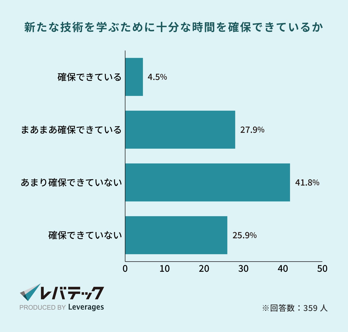 新たな技術を学ぶために学習時間を確保できているかという質問に対して、約7割のITエンジニアが「確保できていない」と回答しました。