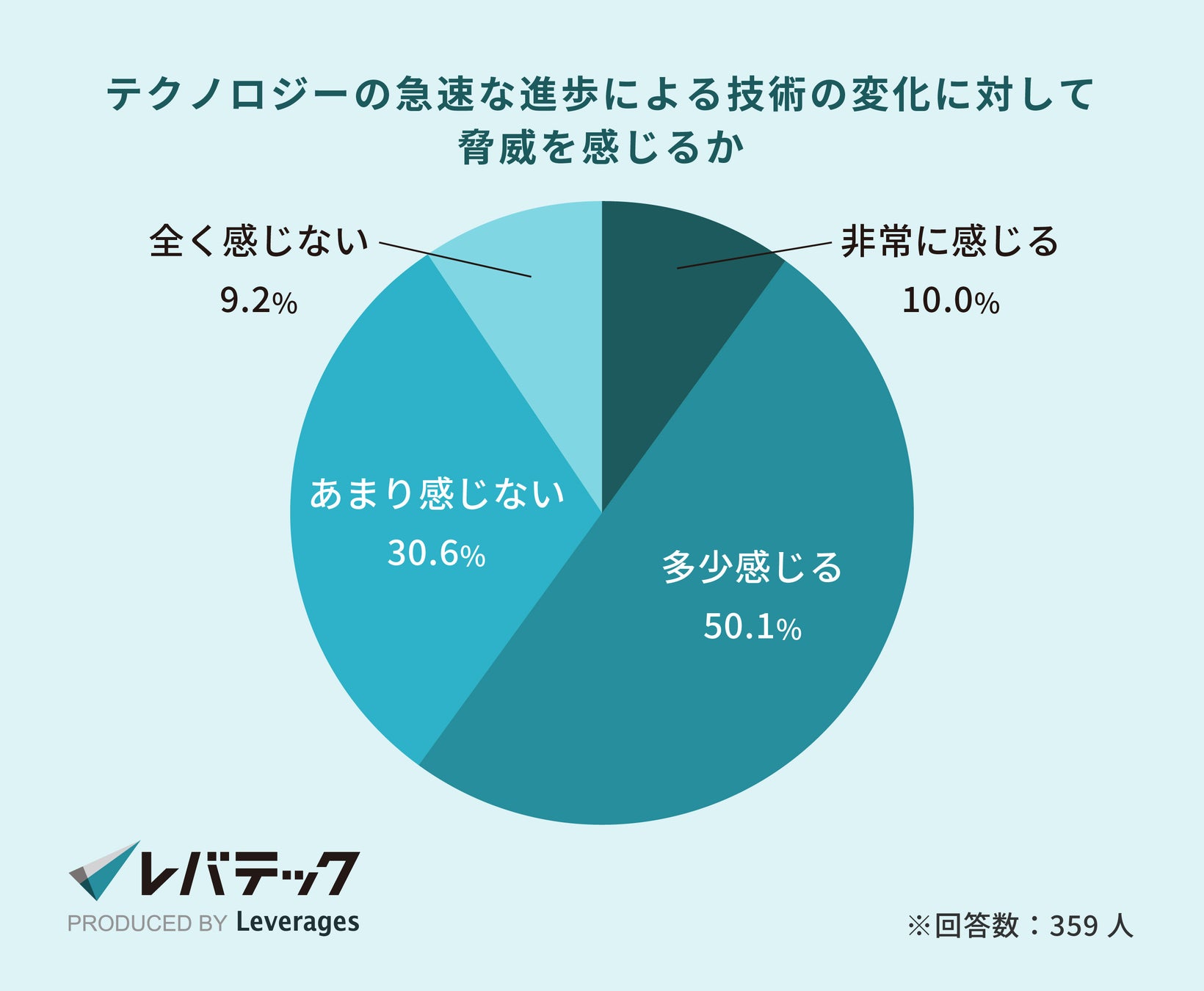 近年、生成AIやブロックチェーン、拡張現実(AR)など、新たなテクノロジーが次々と生まれています。このような急速な技術の変化に脅威を感じているかという質問に対して、約6割のITエンジニアが「脅威を感じる(60.1%)」と回答しました。