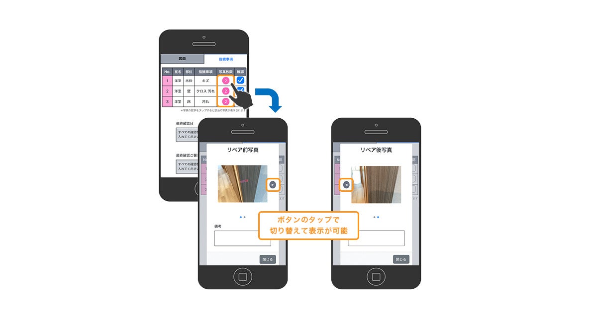 リペア前とリペア後の写真をスマートフォンから確認することが可能です。また、確認会への参加が難しい場合でも、遠隔から修繕状況を購入者自身で確認することができ、再来訪の負担を軽減します。