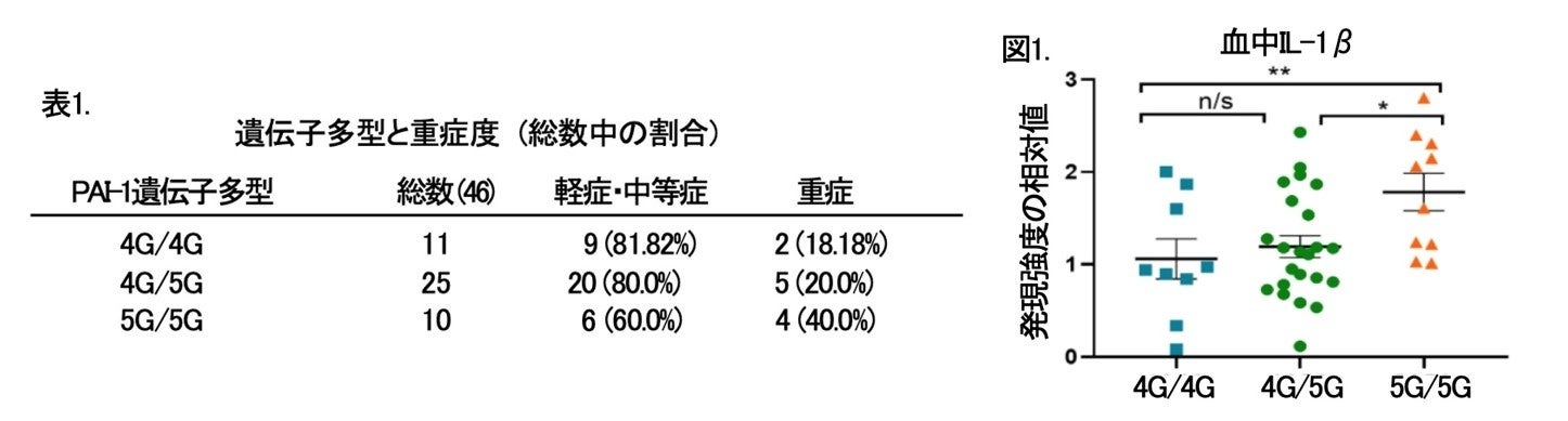 PAI-1プロモーター遺伝子多型には4G/4G、4G/5G、5G/5Gが存在しており、遺伝学的に日本人に多い4G/4Gの患者では、4G/5G、欧米に多い5G/5Gの患者と比較して血中のプラスミノーゲン活性化因子と複合化したPAI-1が高値で循環し、IL-1β(*8)とプラスミンが有意に低値であったことから、線溶系と炎症性サイトカインの産生が抑制されていることが示唆されました。また重症患者の中で5G/5Gの占める割合が有意に高いことが、判明しました(図1)。研究グループは、日本人患者のCOVID-19の重症度が、ドイツ人と比較して有意に低いことを報告していますが( Biomedicines. 10, 2549; 2022)、この研究成果がその理由を示唆している可能性があります。