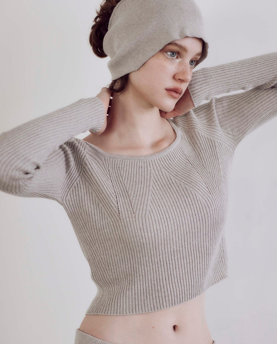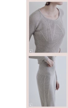 ブランド初となるニットウェアについても、コンセプトに忠実に、体に沿う立体的なプロダクトとして機能美と快適性を 追求。ニット特有のバストやヒップ、体のラインが強調されすぎるという課題を、編地の変化で緩和させ、自然に美しくみせるデザインとして昇華。ホールガーメント®を採用することで、完全無縫製で編立て、綿・レーヨン・シルクの素材感と合わせて、なめらかな肌あたりを実現しました。