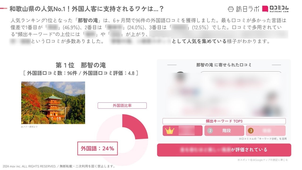 業界最大級のインバウンドビジネスメディア「訪日ラボ」及び 店舗向け集客一元化プラットフォーム「口コミコム」を運営する株式会社mov(代表取締役:渡邊 誠、本社:東京都渋谷区、以下mov)は、各都道府県の観光スポットに寄せられた最新の口コミデータから、独自の『インバウンド人気観光地ランキング』を発表しました。