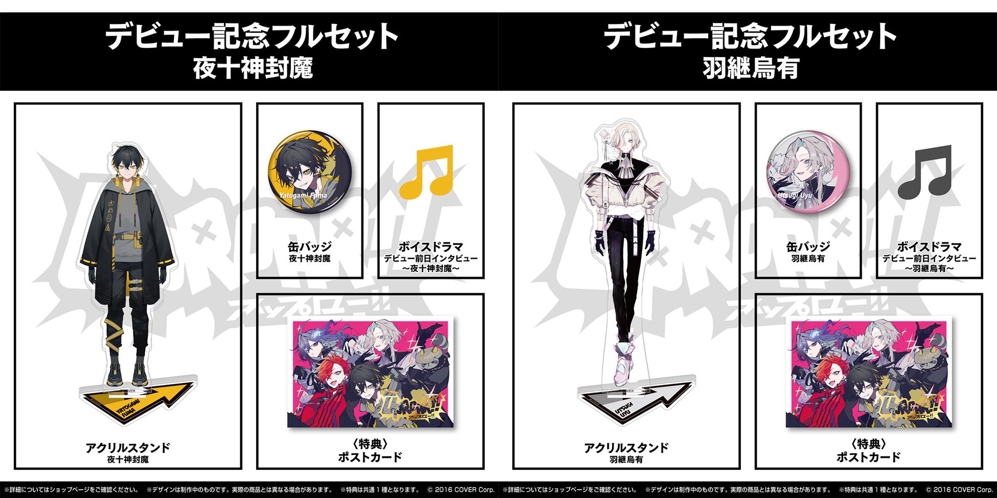 「デビュー記念フルセット」は通常衣装のアクリルスタンドと、「望月けい」先生描き下ろしキービジュアルイラストを使用した缶バッジ、そして《UPROAR!!》の各メンバーのデビュー前日インタビューを収録した記念ボイスの3点がセットとなっています。また、セット特典として「望月けい」先生描き下ろしキービジュアルイラストのポストカードが付属いたします。