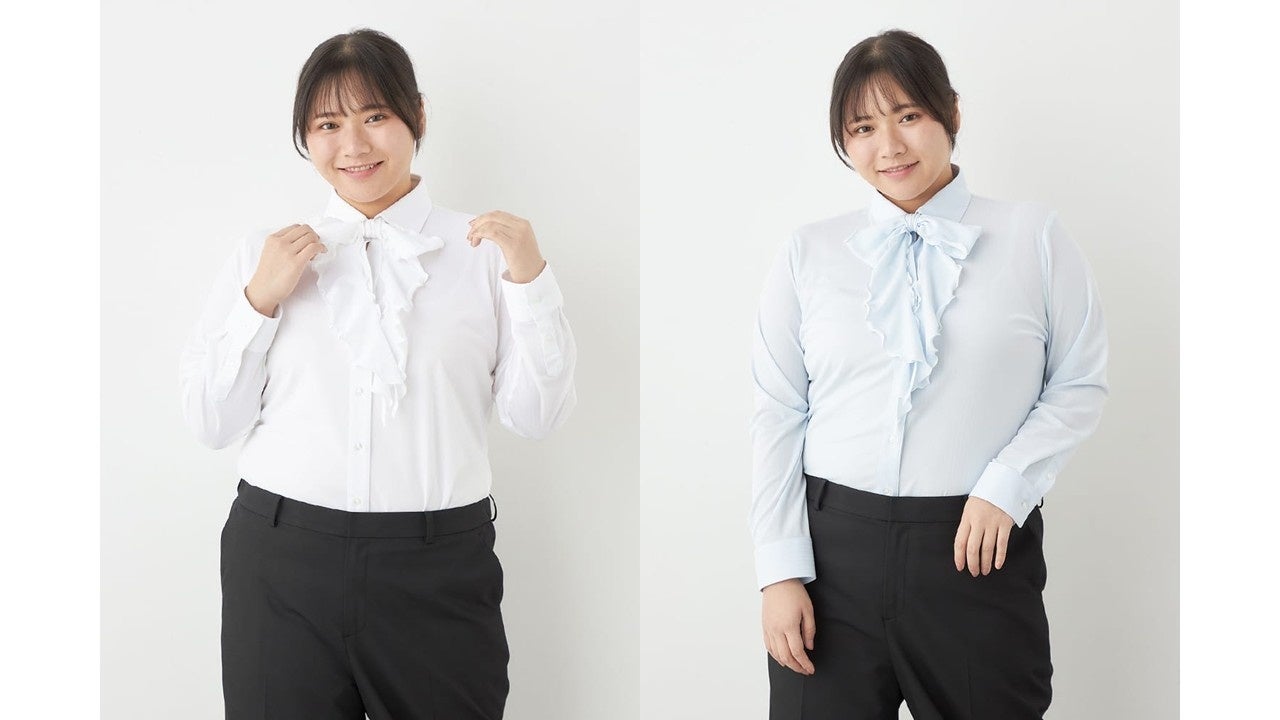 本商品は、「大きいサイズでも可愛いデザインのブラウスが欲しい」というお客様の声に応えて開発いたしました。i-shirtの特長である圧倒的な形態安定性※注2と吸水速乾機能※注3を備えた素材を採用し、開発に時間をかけて実現。さらに、ボタンで着脱可能なリボンを付け、取り外すとスキッパーブラウスとしても着用いただける2WAY仕様にしました。フレッシャーズの方々が、入学式からビジネスシーンまで幅広く活用いただける洗練されたブラウスとなっております。
