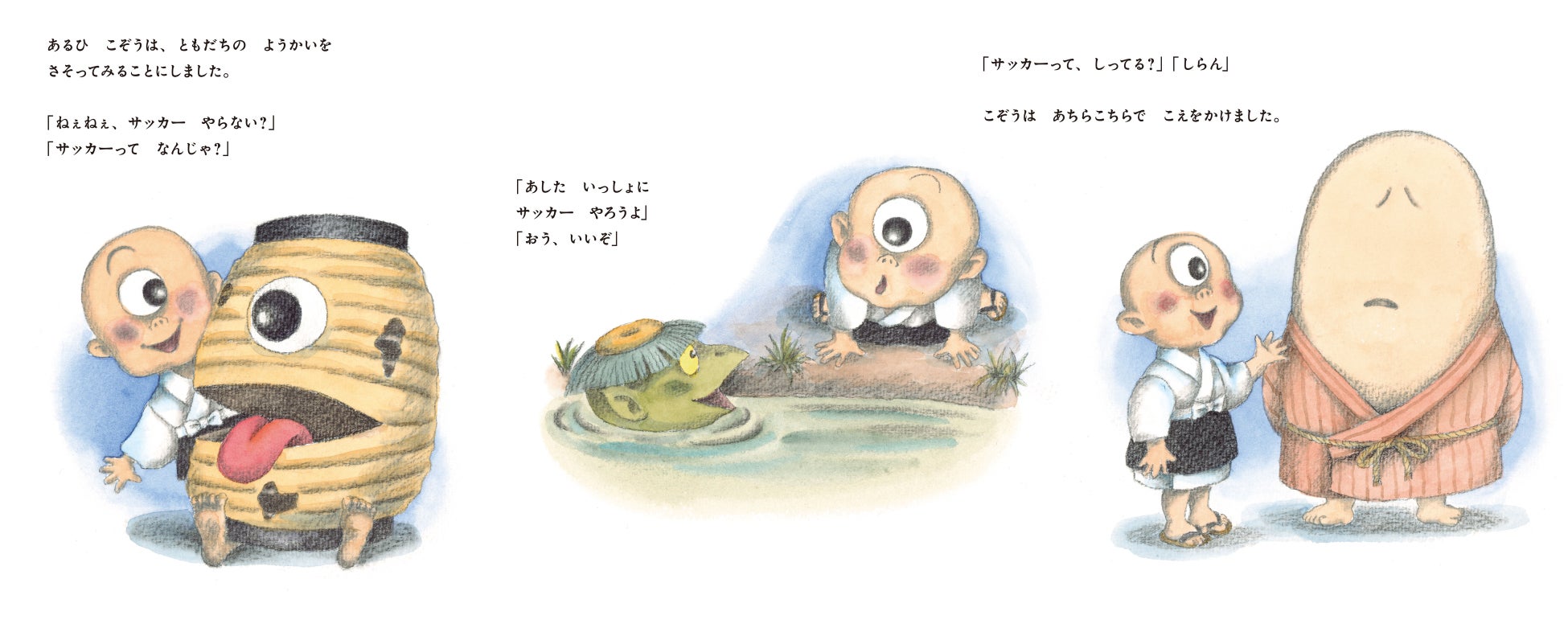 ひろかわさんからは、絵の苦労話も。水木しげるさんの妖怪に似ないよう、更に古い参考資料を研究し、キャラクターをデザインされたそう。また、制作過程で聞かせ屋。けいたろうさんや担当編集者からサッカーの動きの細かい指定やリクエストがあり、「妖怪は好きだけれど、サッカーを描くのにはとても苦労した」とこぼす場面も。心が折れそうになりながらも、愛嬌のある妖怪たちを躍動感たっぷりに描き上げました。