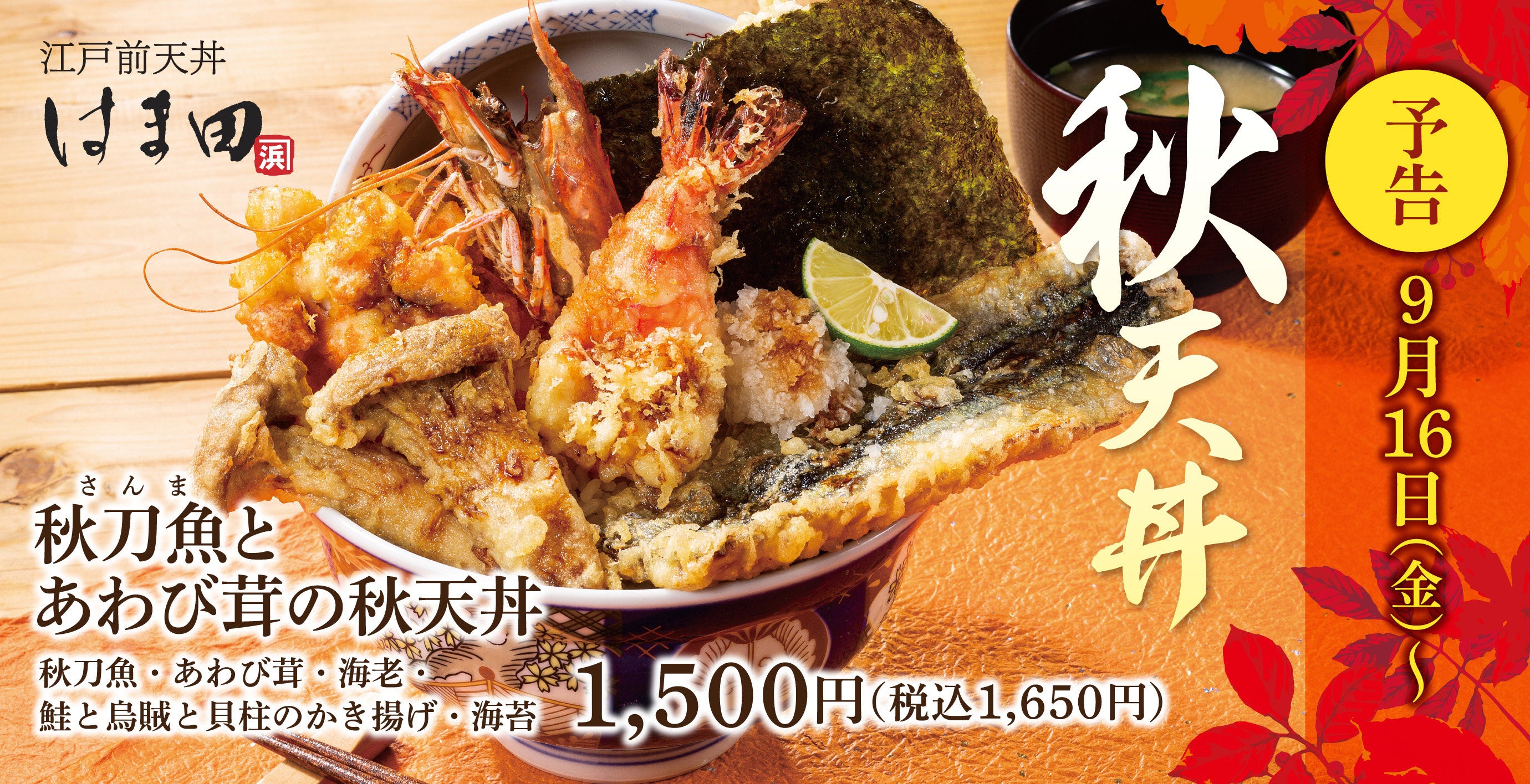 【秋天丼】江戸前天丼はま田に「秋刀魚とあわび茸の秋天丼」が新登場!
