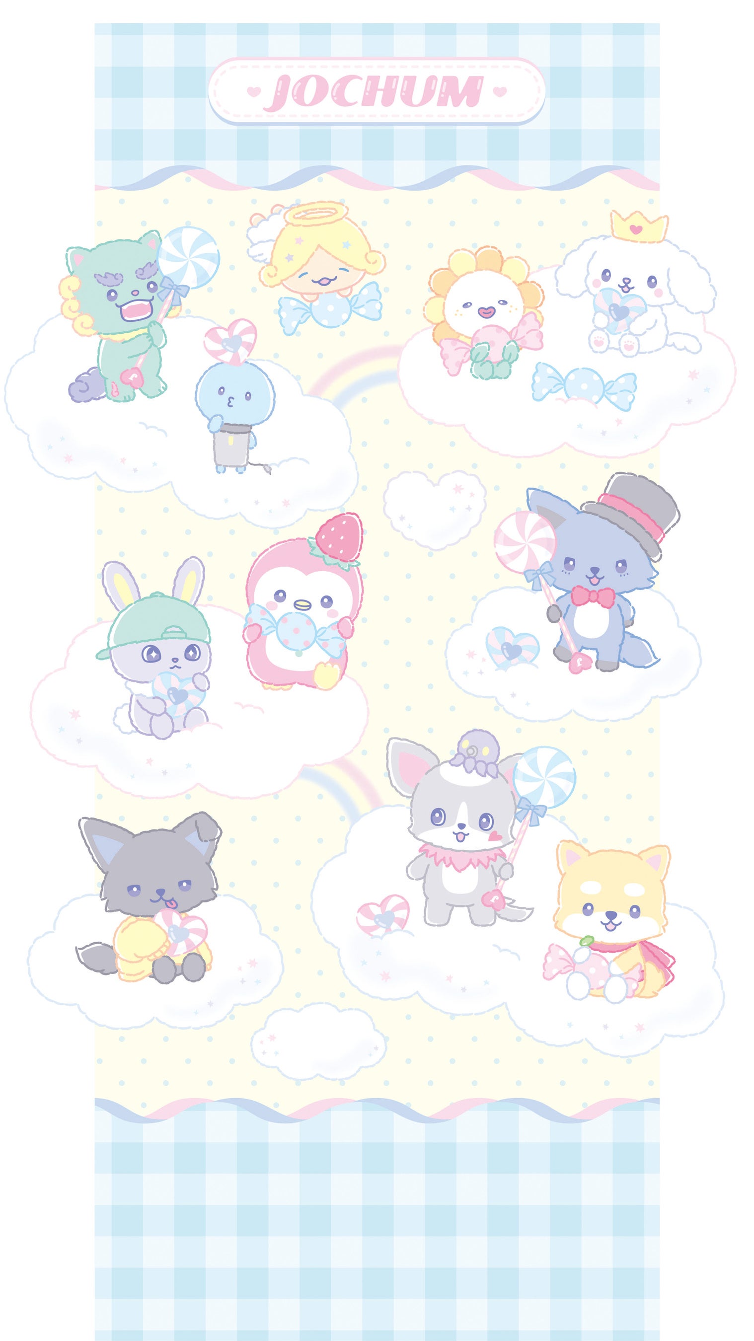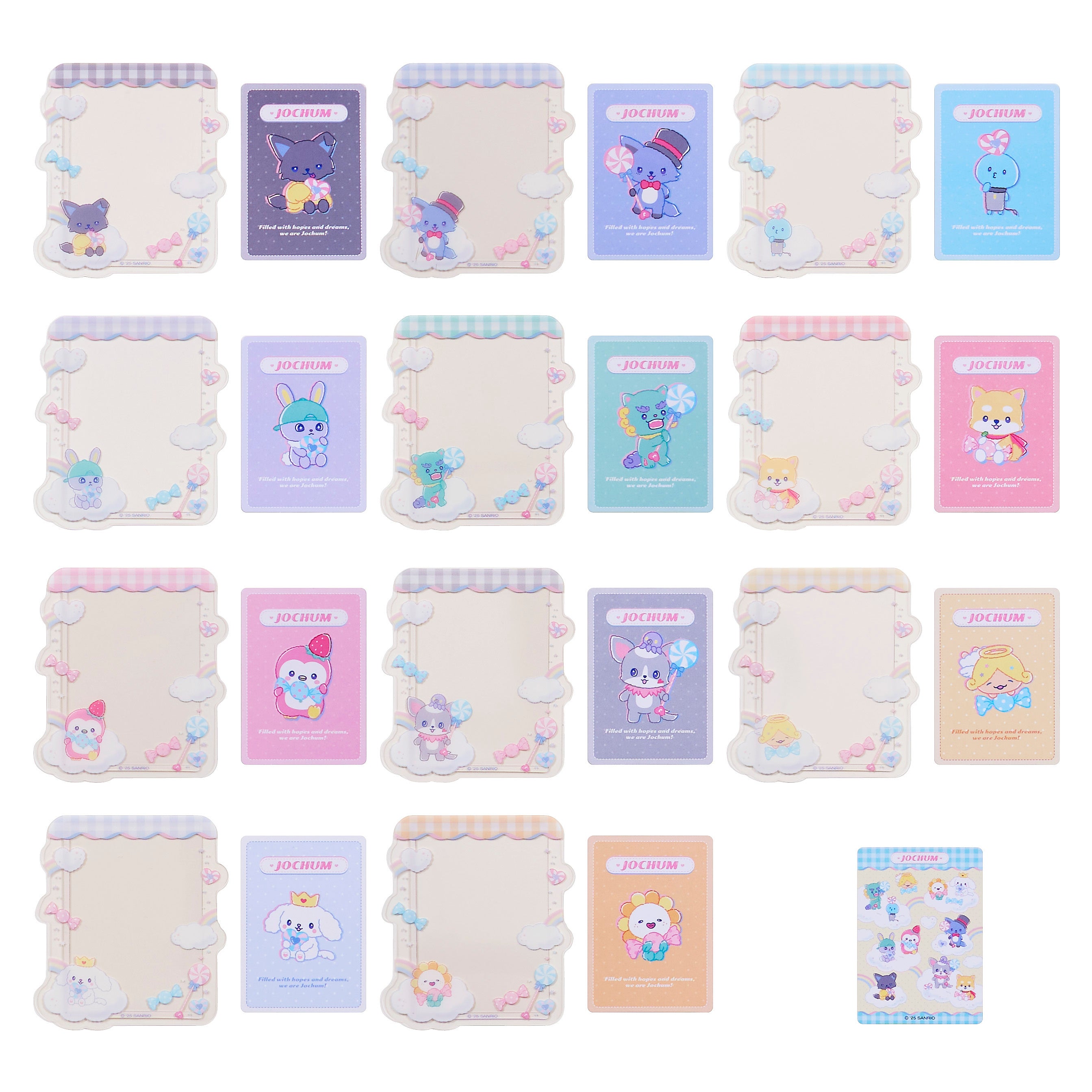 「JOCHUM」は、2022年に人気グローバルボーイズグループJO1とサンリオが共同開発したキャラクターです。”ここで暮らした人は夢が叶う”…そんなおうちに住んでいる11にんの仲間たち。まめちぃはヒーローに。ぽぽは楽な人生を。ヤヌカミは立派な守り神。ピーハイはパイロットに。RURUはみんなの癒しの王様。レインは世界中の人を驚かすこと。Biraは世界的なアーティストになること。マイクンは歌でみんなを明るくすること。チュララは宇宙侵略。ちまたは世界中の寿司を食べつくすこと。もこは世界中のみんなを幸せにすること。それぞれの夢に向かって日々奮闘中!