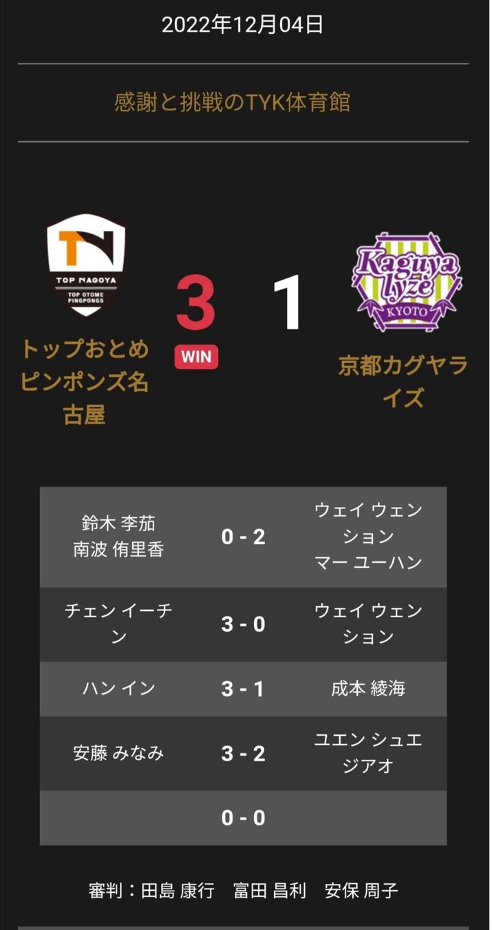 ノジマTリーグ 2022-2023シーズン 公式戦 12月4日開催 トップおとめピンポンズ名古屋 vs 京都カグヤライズ 試合結果