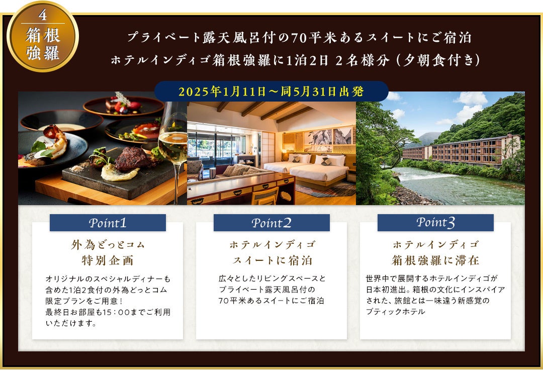 対象期間中に『CFDネクスト』にて新規・決済取引の数量が合計500,000取引単位以上のお取引を達成されたお客様全員へ、プライスレスな極上の旅をプレゼントいたします。