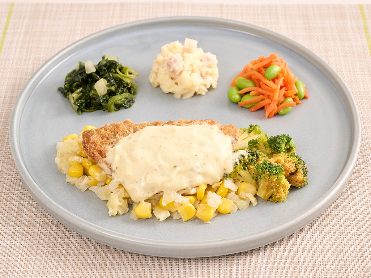 今回新登場する「カレータルタルアジフライ」は、家庭でもおなじみのアジフライに、ほんのりスパイシーなカレー風味の特製タルタルソースを合わせた、ありそうでなかった新しい味わいの一品です。ふんわりジューシーに揚げたアジに、まろやかで甘口のカレータルタルソースをたっぷりとかけることで、お子さまでも食べやすく、家族みんなでお楽しみいただけます。さらに、付け合わせにはシャキシャキとしたキャベツや甘みのあるコーンを添えており、ソースを絡めて食べることで、野菜もおいしくしっかり摂れる栄養バランスに配慮したワンプレートに仕上げました。副菜は、オニオンドレッシングでさっぱり仕上げたほうれん草のソテー、ベーコンの風味がアクセントのベーコンポテサラ、彩り豊かな枝豆にんじんです。