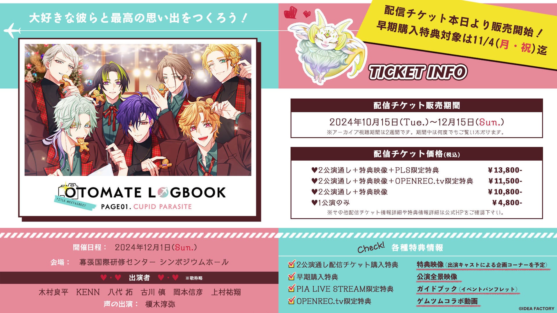 アイディアファクトリー株式会社(代表取締役社長:佐藤 嘉晃/所在地:東京都豊島区)の女性向けゲームブランド「オトメイト」は、2024年12月1日(日)に開催する「キューピット・パラサイト」の単独イベント「OTOMATE LOGBOOK PAGE01. CUPID PARASITE」の配信チケット情報を公開いたしました。