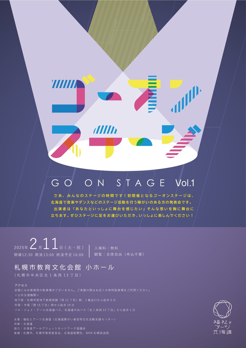 道内で活動する障がい者の芸術文化活動の活躍の場を拡げ、障がいの有無を問わず多様な人々との交流が促進されることを目的に、この度、ステージ発表会「ゴーオンステージ」を開催します。