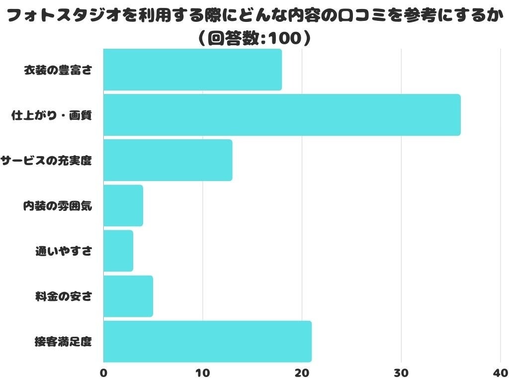 フォトスタジオを利用する際にどんな内容の口コミを参考にするかをアンケートにて調査したところ、1位は「仕上がり・画質」でした。