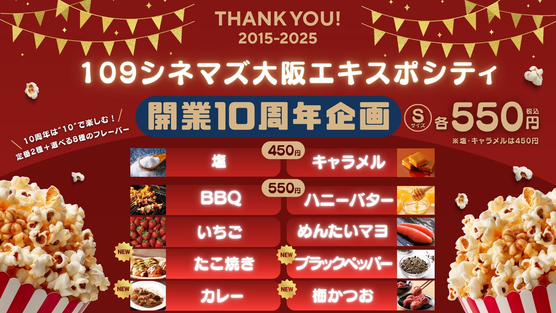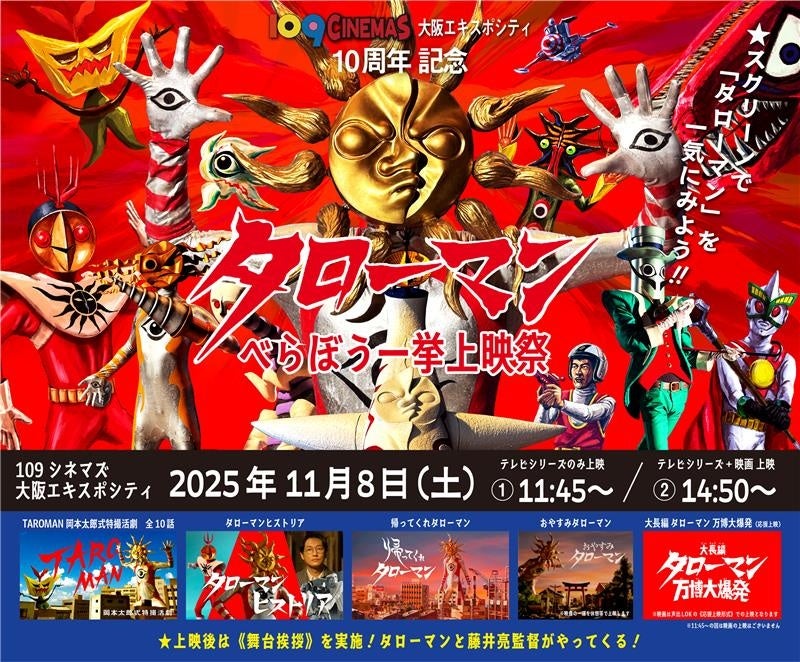株式会社東急レクリエーション(本社:東京都渋谷区、社長:木村 知郎)は、109シネマズ大阪エキスポシティ(大阪府吹田市千里万博公園2-1 EXPOCITY内)の開業 10周年を記念して、IMAX®レーザー/GTテクノロジーの特別企画を実施します。観客動員数TOP10を予想する「IMAX®10年の傑作選!観客動員数TOP10を予想せよ!」や、公式Xでリクエストの多かった作品を上映する「IMAX®レーザー/GTテクノロジーリクエスト上映」、さらに「タローマン」テレビシリーズと映画を上映する「タローマンべらぼう一挙上映」に加え、ポップコーンフレーバー10種類を期間限定で販売します。