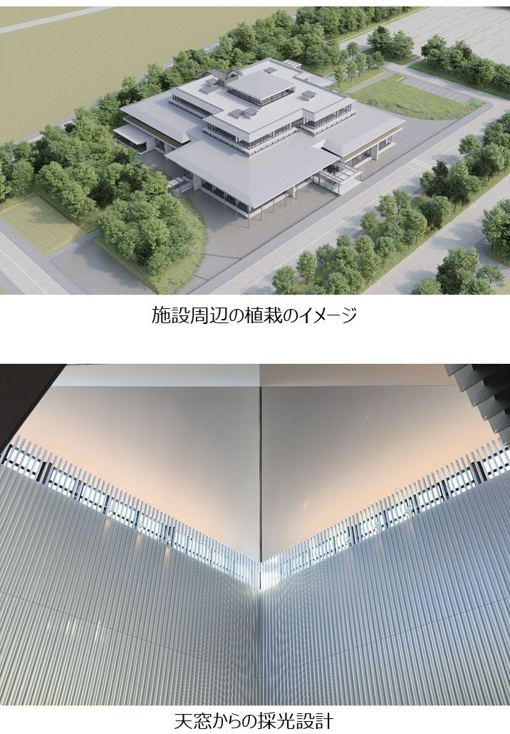 「水環境」として、空調や屋外に設置した水盤には敷地内に自噴する井戸水を利用するとともに、⽔盤の気化熱を利⽤した冷涼な⾵を屋内に取り入れています。