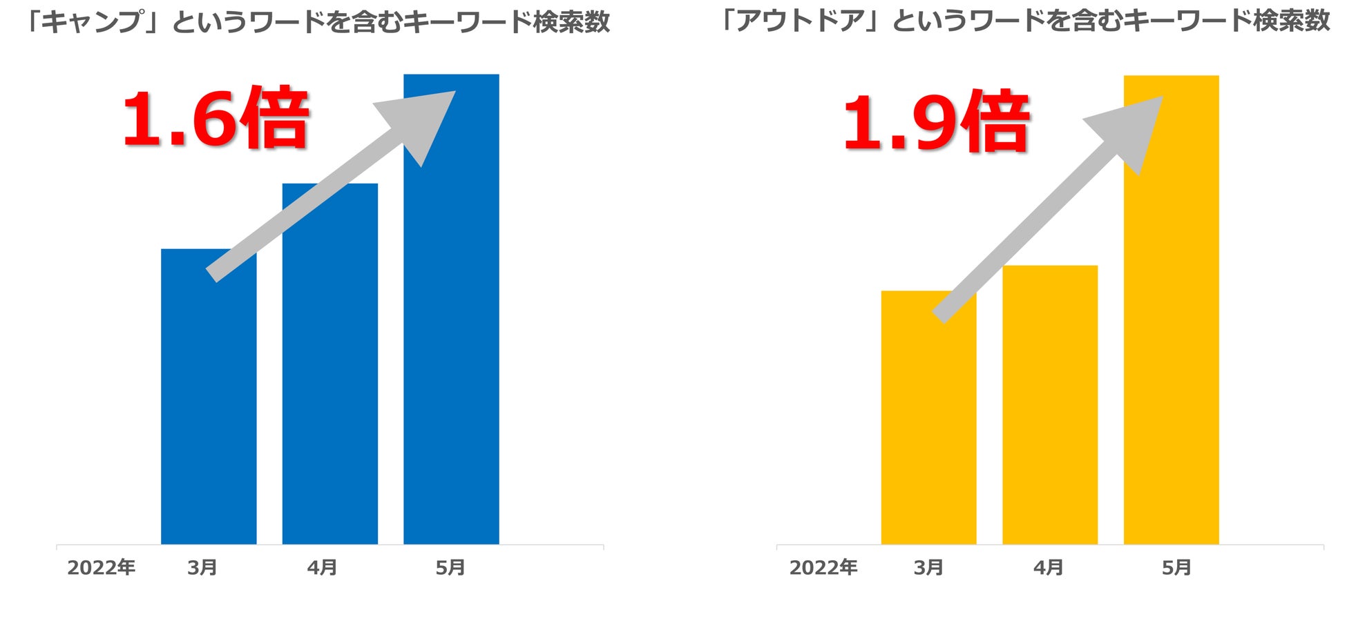 2022年の"ふるなび"サイト内キーワード検索調査によると、3月から5月にかけて「キャンプ」及び「アウトドア」というワードを含む、キーワード検索数が顕著に伸びている事がわかりました。
