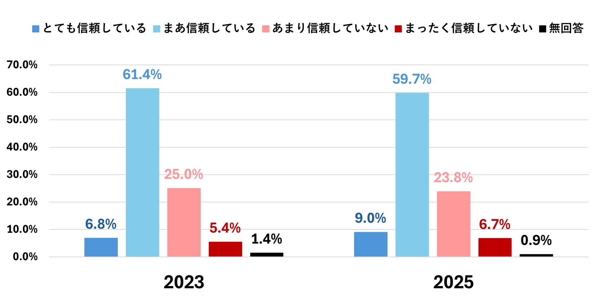 テレビ、新聞、ラジオといったマスメディアへの信頼をたずねたところ、68.7%が信頼している(とても信頼している+まあ信頼している)と回答しました。前回調査(2023年)では68.2%で、ほぼ同じでした。