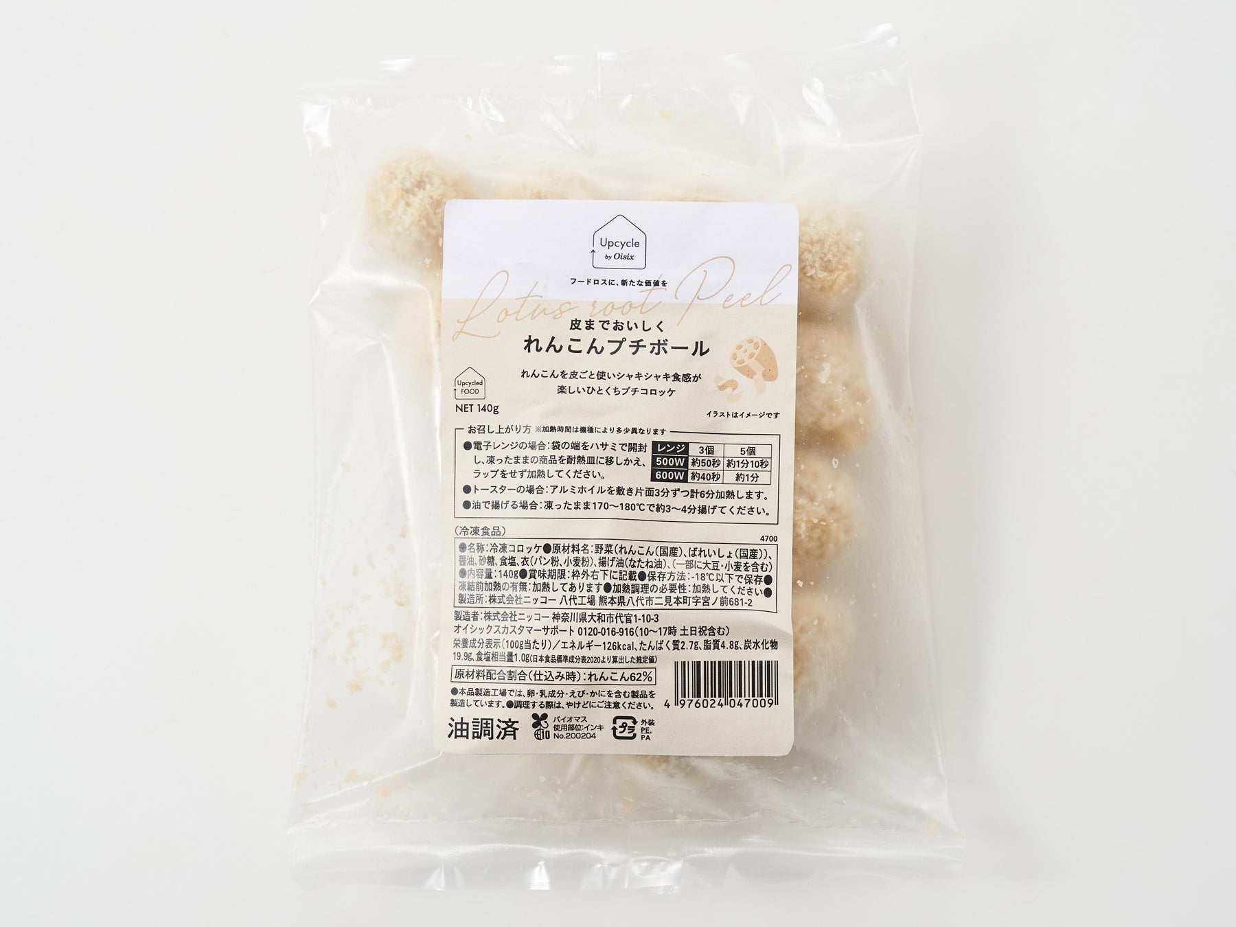 本来は剥かれて廃棄される国産れんこんの皮もまるごと使い、シャキシャキとした食感が楽しい一口サイズのプチコロッケ。醤油であまじょっぱく味付けをし、お弁当にもおすすめです。