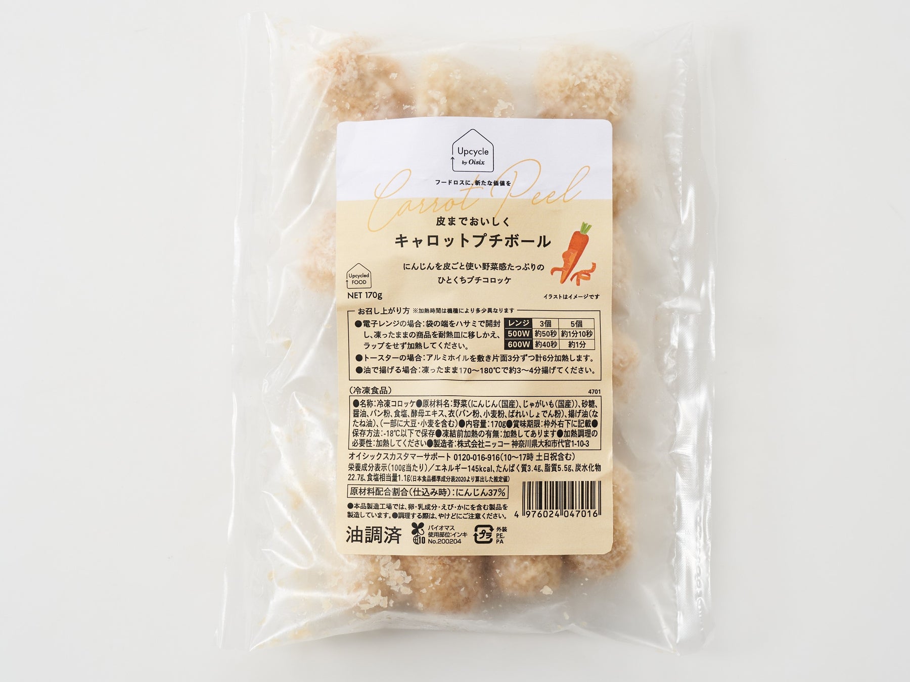 野菜を加工した食品を作る工場では、通常、にんじんやれんこんは皮を剥いてから使われることが多く、製造時に大量の皮が廃棄されています。今回の商品では、皮もまるごと使うことでフードロスを抑えて商品化。さらに、皮を剥く作業がないため、皮剥き機などに収まらない規格外の食材も活用することができています。また、キャベツを加工で使用する際は従来は芯は抜き取られて廃棄になっていますが、この芯をコロッケに活用し、新たな食品へと生まれ変わらせました。本年春にキャロットプチボールをテスト販売したところご好評をいただいたため、野菜をまるごと味わえるように加工した、一口サイズのアップサイクルコロッケとしてシリーズ化を開始します。