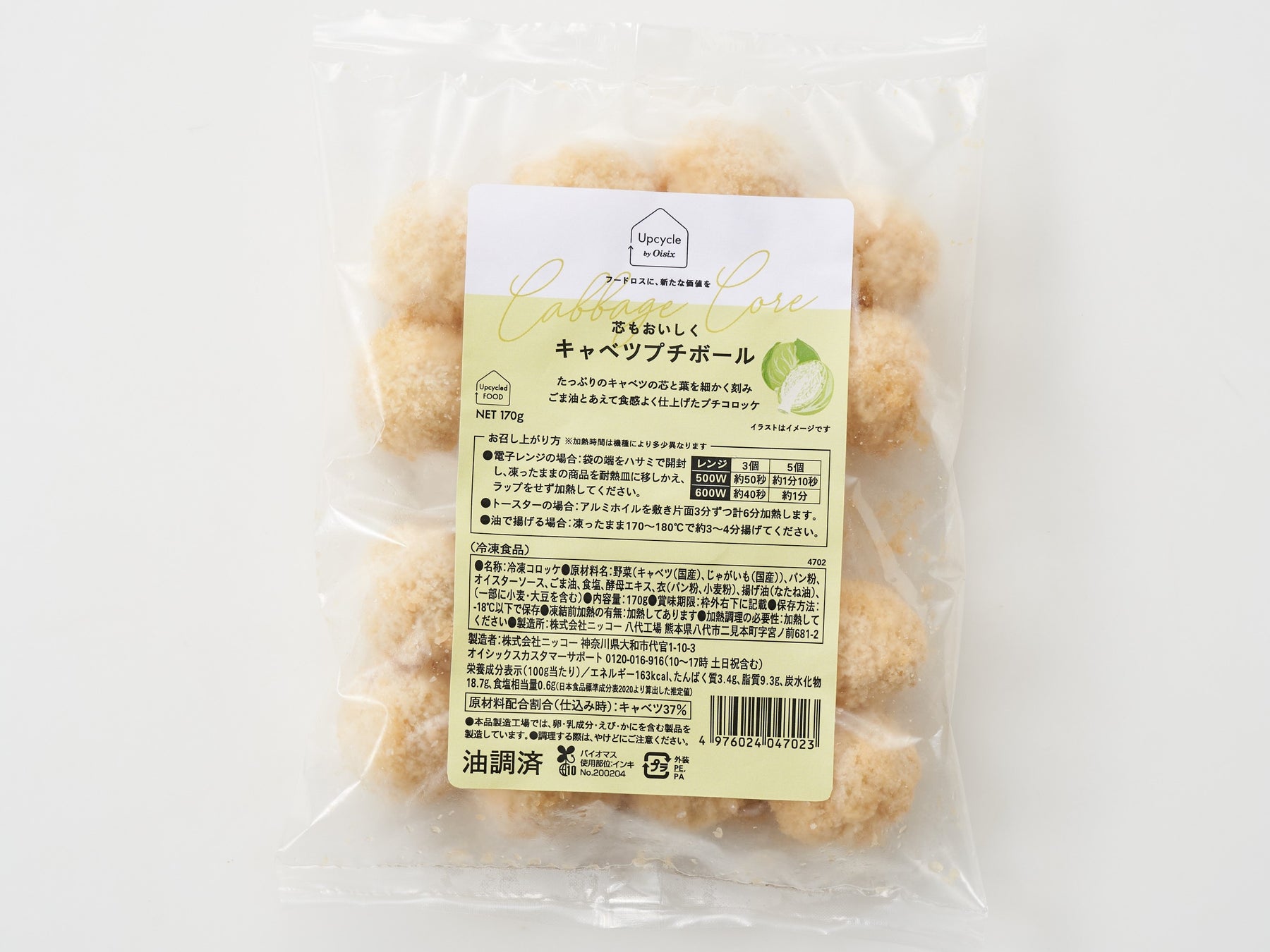 これまで廃棄されていた国産キャベツの芯を食感よく仕上がるように刻み、国産じゃがいもと合わせた一口サイズのプチコロッケ。ごま油の風味が食欲をそそります。