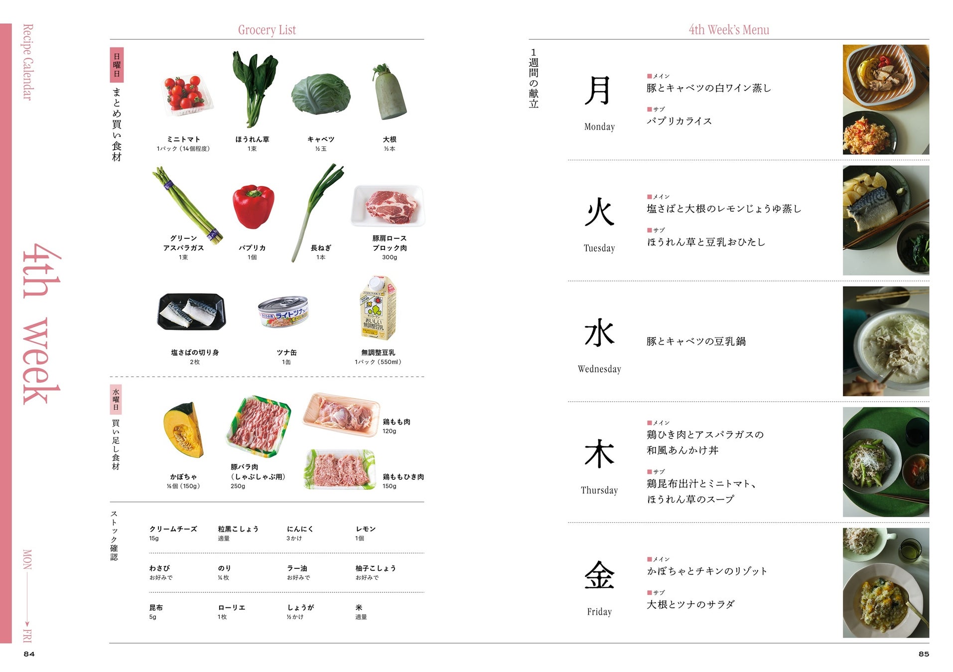 5日間で使い切れる量や栄養バランスを考慮した食材まとめ買いリストと、その食材を用いた献立を4週間分提案する、カレンダー式のレシピです。買い物や献立を考える“思考コスト”を最小限に抑え、料理の楽しいところだけを感じられるよう工夫した、忙しい現代人にぴったりの内容です。