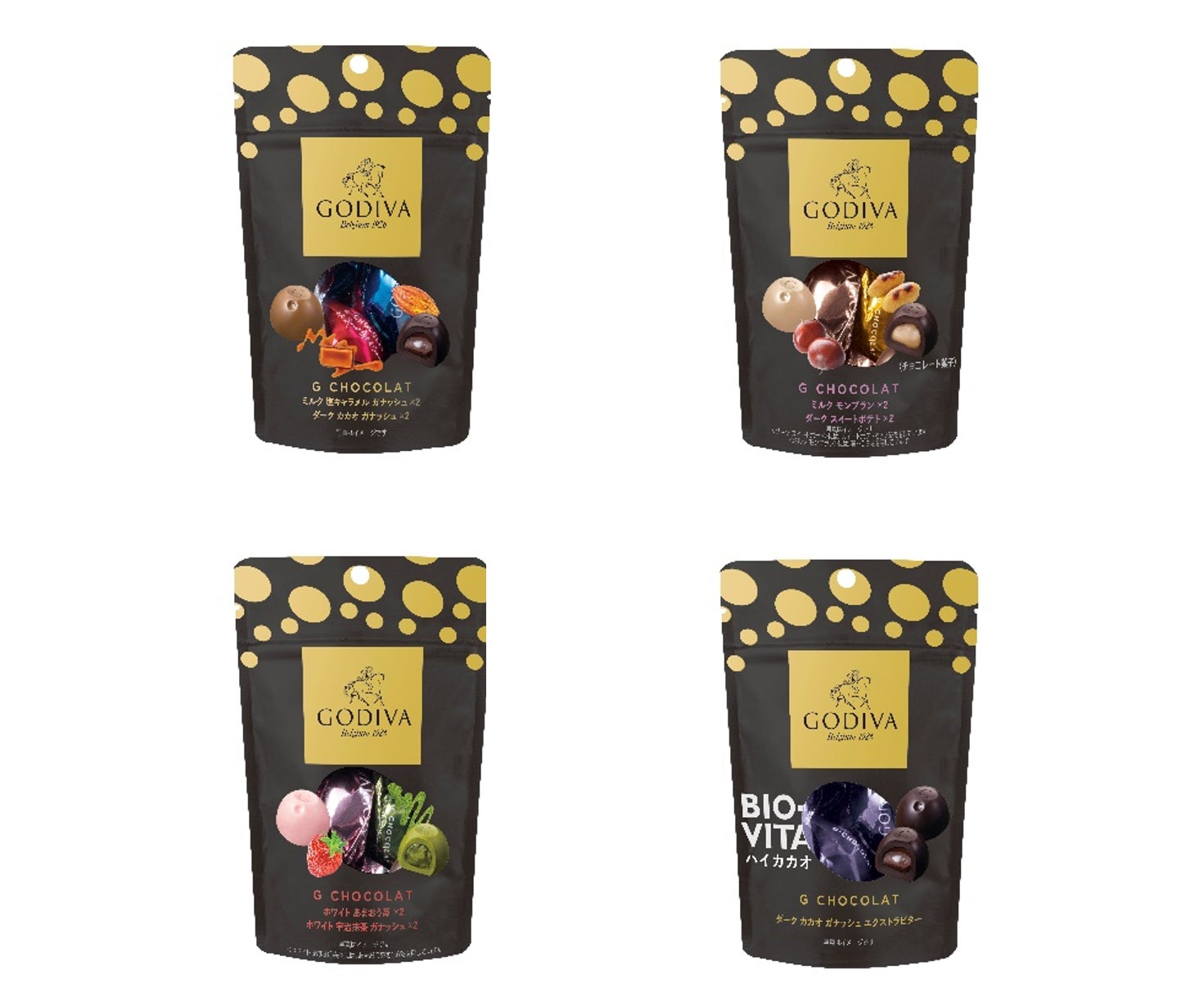 左上から時計回りに、G ショコラ 4粒入 (塩キャラメル×2粒/ダーク×2粒)、G ショコラ 4粒入 (スイートポテト×2粒/モンブラン×2粒)、G ショコラ 4粒入 (エクストラビター×4粒)、G ショコラ 4粒入 (あまおう苺×2粒/宇治抹茶×2粒)、