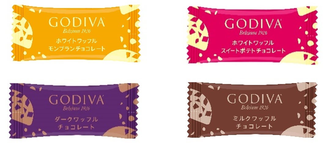 左上から時計回りに、限定フレーバー ホワイトワッフルモンブランチョコレート、限定フレーバー ホワイトワッフルスイートポテトチョコレート、ミルクワッフルチョコレート、ダークワッフルチョコレート