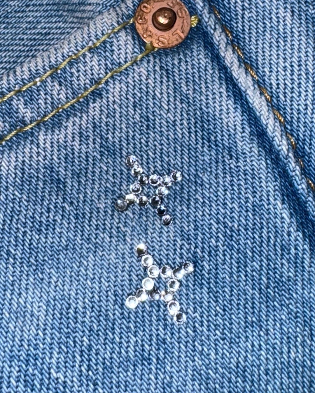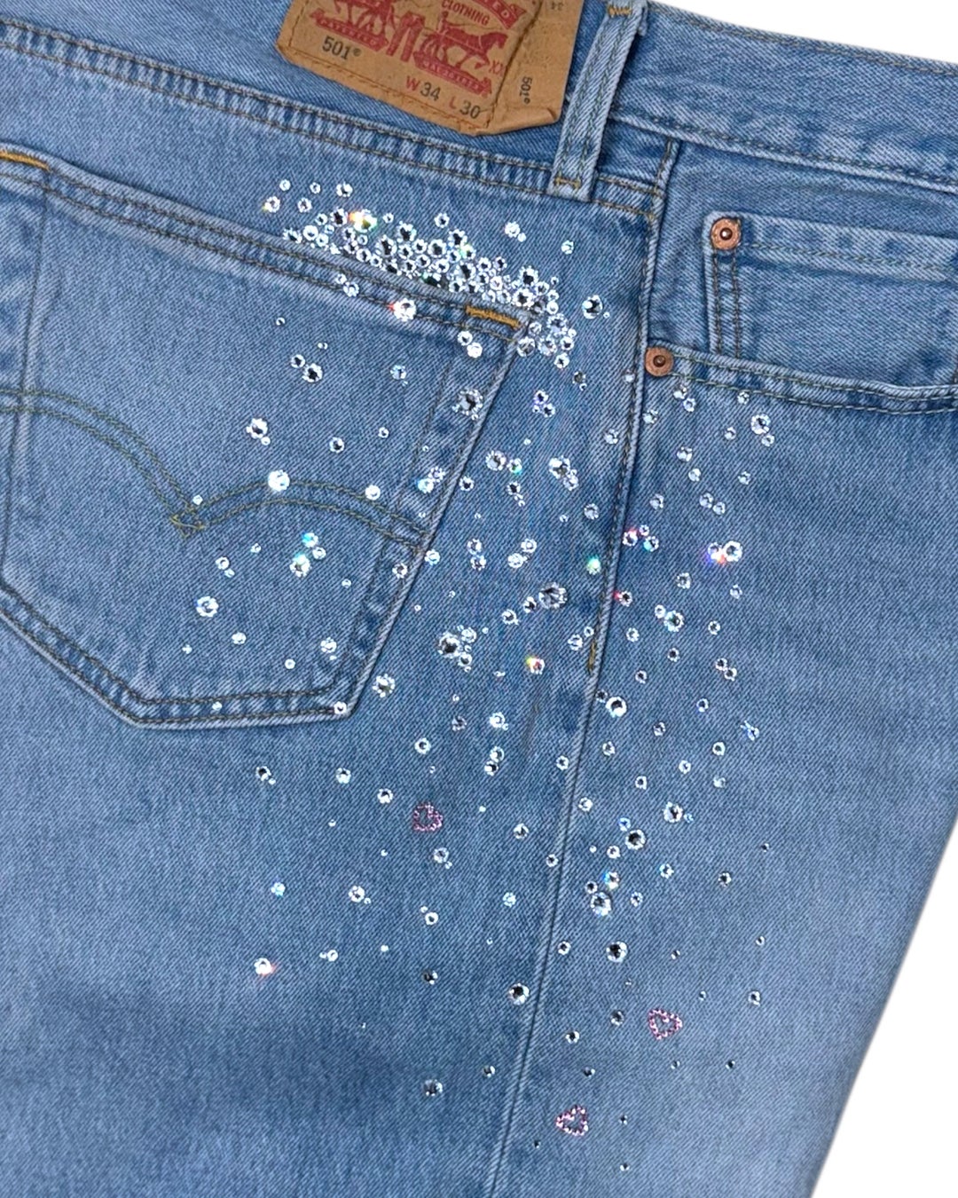 後ろポケットから溢れてこぼれ落ちるかのように装飾されたスワロフスキーは、動くたびに美しい輝きを放ち、その存在感を際立たせています。
