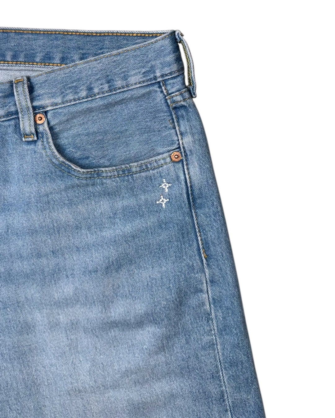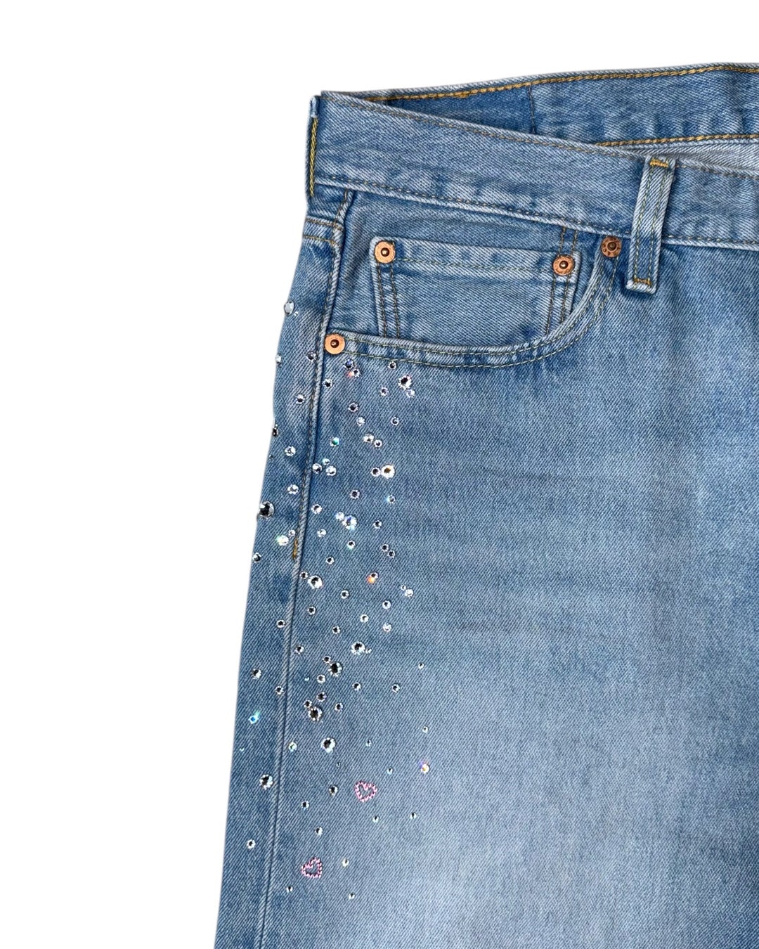 「Levi’s 501」のタイムレスなデニムに、スワロフスキークリスタルの輝きを纏わせた、世界にひとつだけのカスタムモデル。すべてのクリスタルは、「Couture」に所属する熟練のアーティストが、一粒ずつ丁寧に手作業でセット。デニムの無骨さとラグジュアリーな輝きが融合した、他にはない特別な一本です。