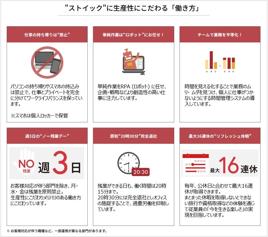 ジャパネットグループでは、人生の大部分を占める会社という場所で、従業員一⼈ひとりが心もからだも健康な状態でいきいきと働くことのできる環境を大切にしています。また、生産性にこだわり、会議実施不可時間となる「ノー会議タイム」などのルールにより、限られた時間でいかに仕事の生産性を高めるかを重要とします。業務スピード、業務効果を維持しつつ、ワークライフバランスに配慮したルール作りと、社会で⻑く活躍できる制度の拡充に努めています。