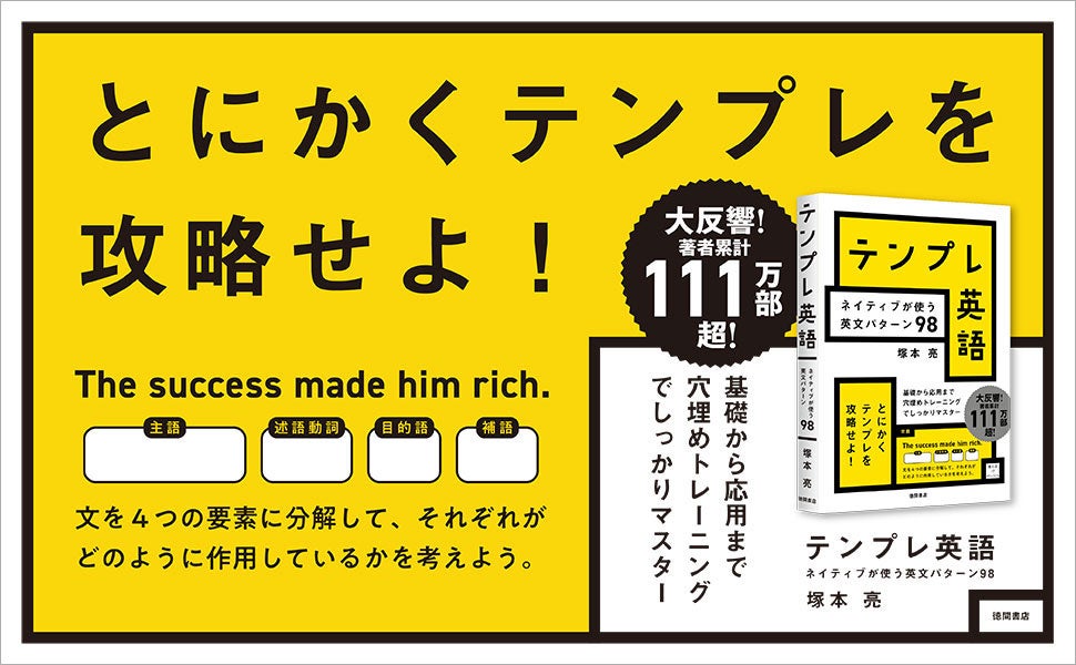 株式会社徳間書店(本社:東京都品川区上大崎 代表取締役社長:小宮英行)は、塚本亮氏による最新刊『テンプレ英語 ネイティブが使う英文パターン98』(https://www.amazon.co.jp/dp/4198658218/)を2024年4月30日(火)に発売いたします。