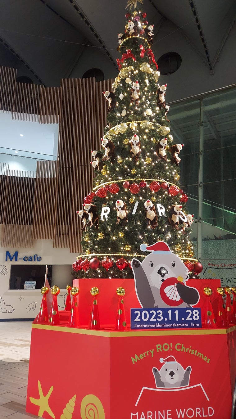 ラッコの『リロ』をテーマにしたクリスマスツリーをセンターガーデンに設置。高さ約6mのツリーには、オーナメントとして『リロ』のぬいぐるみが30体以上飾られます!