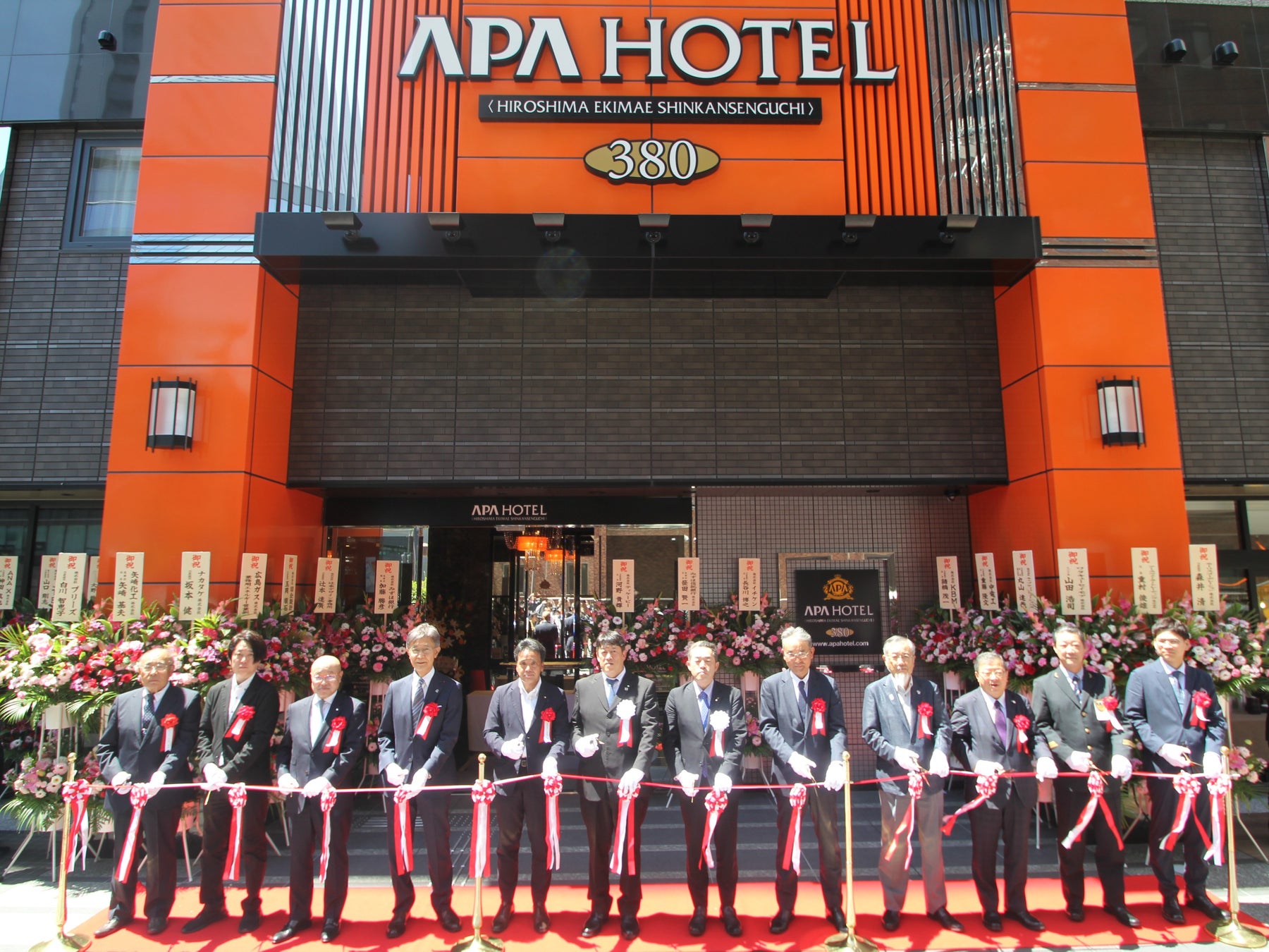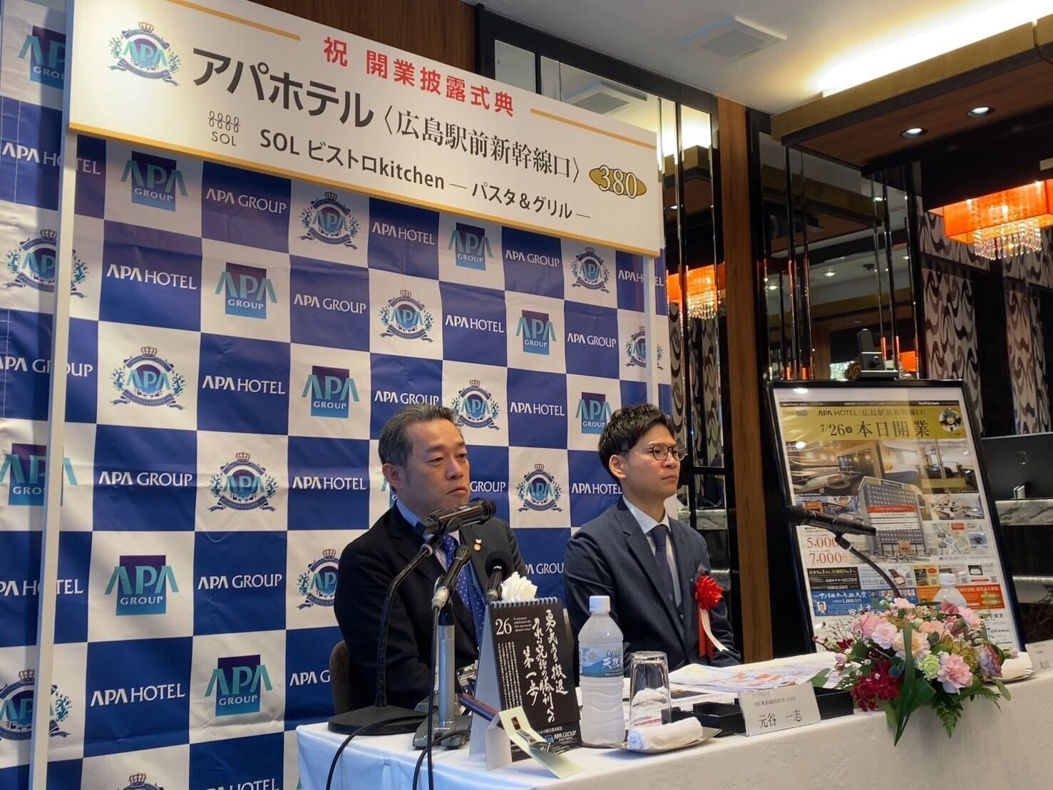 アパグループ社長兼最高経営責任者(CEO)の元谷一志は、記者発表において「現在、広島駅前エリアでは3棟の新規開業計画をしており、その第1号ホテルとして本日開業を迎えることができたことを大変嬉しく思う。当ホテルでは新たに3つのイノベーションポイントを設けたが、最大の特徴として、幅広い宿泊需要に対応できるようにアパホテルとして最大割合となる約半数49.6%の客室を『S-Sコネクトツインルーム』としており、ビジネス、観光問わず多くのお客様にご利用いただきたいと考えている。開業予定も含めると広島駅前エリアで5棟2,017室体制となるが、広島市内の八丁堀エリアや尾道、福山など広島県内の未進出エリアへの展開も視野に入れ、広島県全体で3,000室を目標に今後も拡大していきたい。また、広島に限らず全国で多くの開業を控えているので、アパホテルがオープンすることによって日本全国に元気を届けていきたい。」と述べた。
