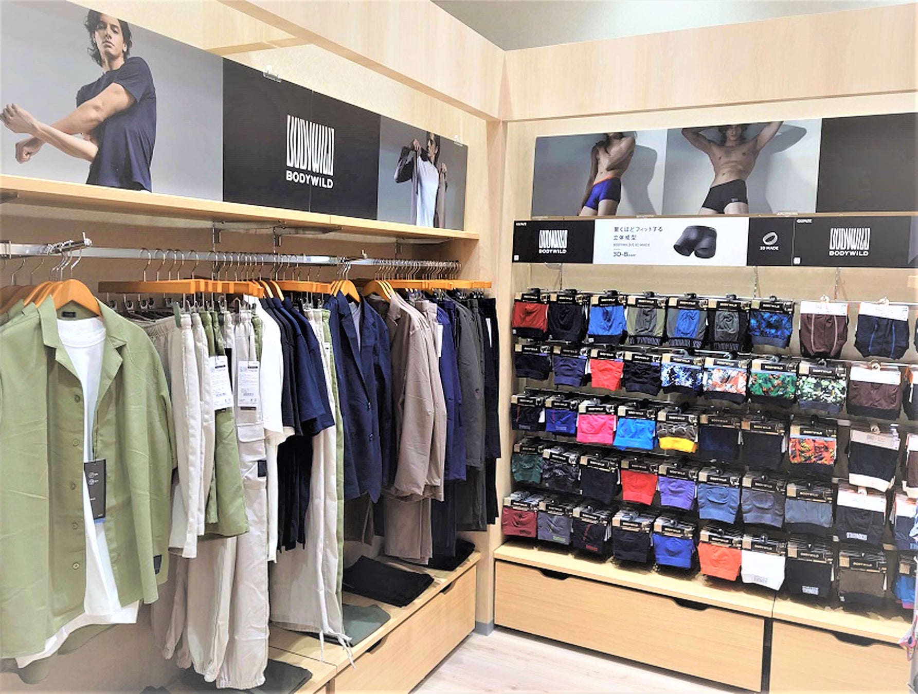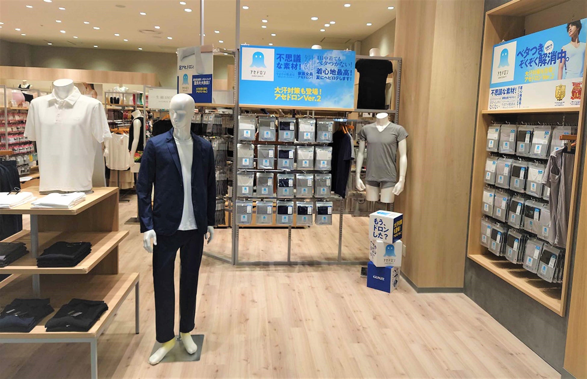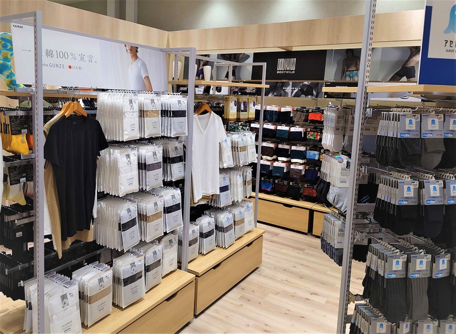 「GUNZE ららぽーと安城店」では、メンズブランド「BODY WILD(ボディワイルド)」のボクサーパンツやアウターウェア、縫い目がない完全無縫製でやさしい着心地を実現した「KIREILABO (キレイラボ)」のレディースインナーなど、デイリーで活躍する幅広いアイテムをラインアップ。さらに、天然素材にこだわった究極のベーシックインナー「the GUNZE」などのグンゼオンラインストア・直営店限定商品や、グンゼ最高クラスの”汗解消”テクノロジー「アセドロン」などお客さまのニーズに応える商品を豊富に取り揃えています。
