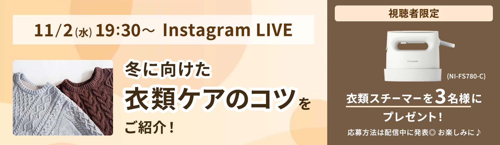 ライブ配信をご覧の方に、抽選で3名様に衣類スチーマーNI-FS780-C(アイボリー)をプレゼント。応募方法はライブ配信中に発表します。パナソニック公式Instagramのアーカイブ動画をご覧の方もご参加頂けます。