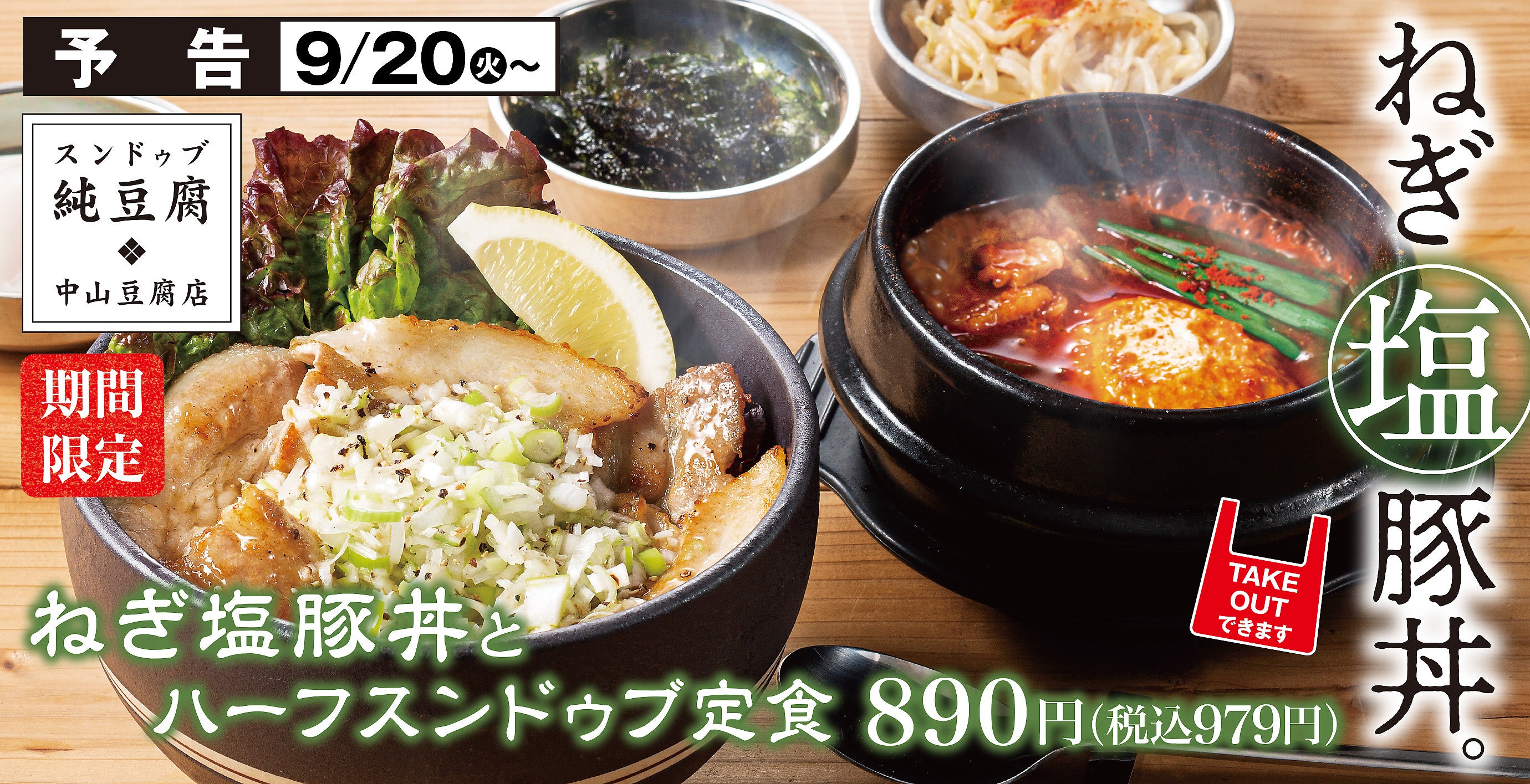 (本社:東京都千代⽥区/代表:嶺岸 悟)は、スンドゥブ定食専門店「純豆腐 中山豆腐店」にて、期間限定メニュー「ねぎ塩豚丼とハーフスンドゥブ定食」を2022年9⽉20⽇(火)より販売を開始いたします。