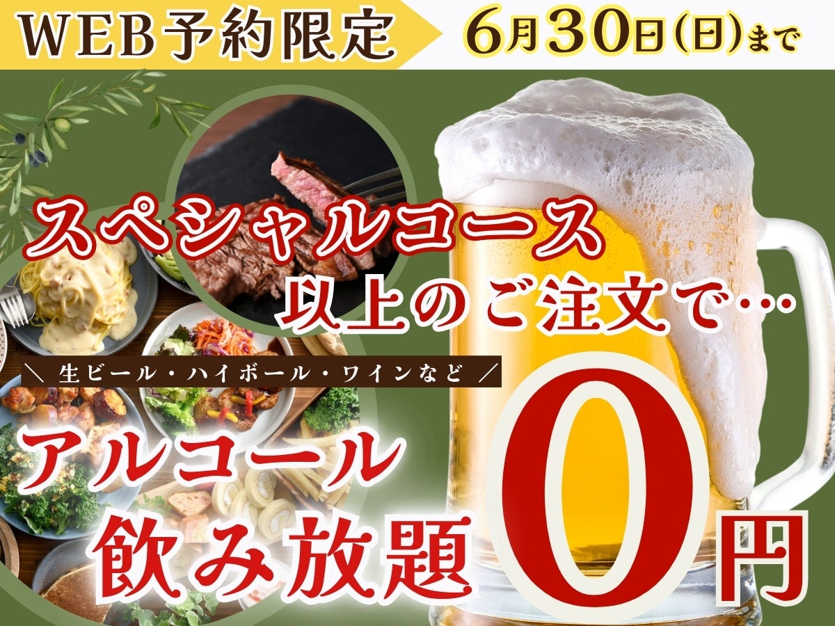 2024年6月30日(日)迄の期間、スペシャルコース以上のご予約にて、生ビールやハイボール、焼酎、ワインなどの豊富なラインナップでお楽しみいただける『アルコール飲み放題 税込825円』がなんと『無料』でご利用いただけます!