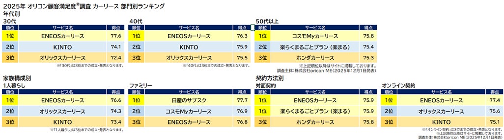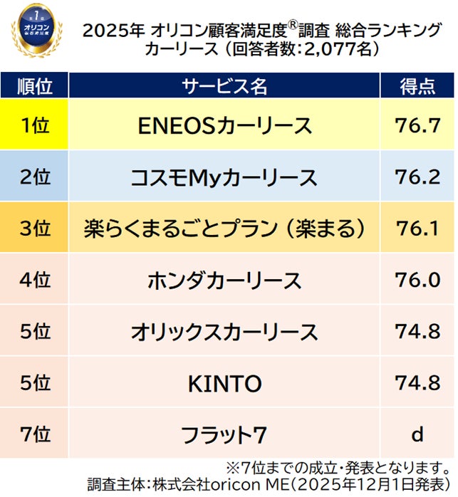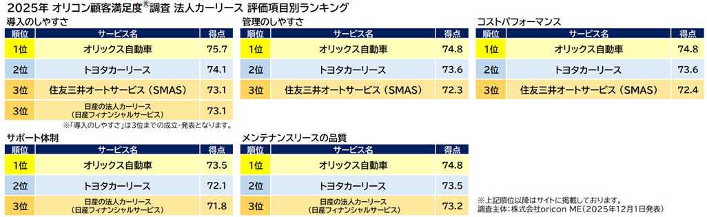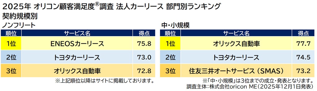 オリコン株式会社(本社:東京都港区 代表取締役社長:小池 恒、略称:オリコン)は、グループ会社である株式会社oricon MEが、実際のサービス利用者を対象に第三者の立場で実施した『カーリース』『法人カーリース』についての顧客満足度調査の結果を、2025年12月1日(月)14時に「オリコン顧客満足度®」公式サイト内にて発表いたしました。ランキングは以下の通りとなりました。
