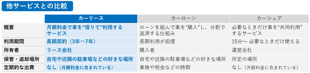 1)月々定額のリース料を支払うことで、車両の使用権を得ることができる 2)個人向けサービスを展開している