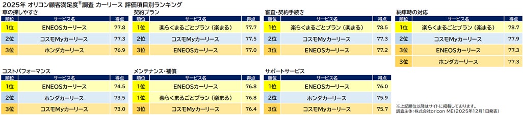 初発表!満足度の高いカーリースランキング『カーリース』【ENEOSカーリース】が総合1位「車の探しやすさ」「コストパフォーマンス」など4項目で1位(オリコン顧客満足度®調査)