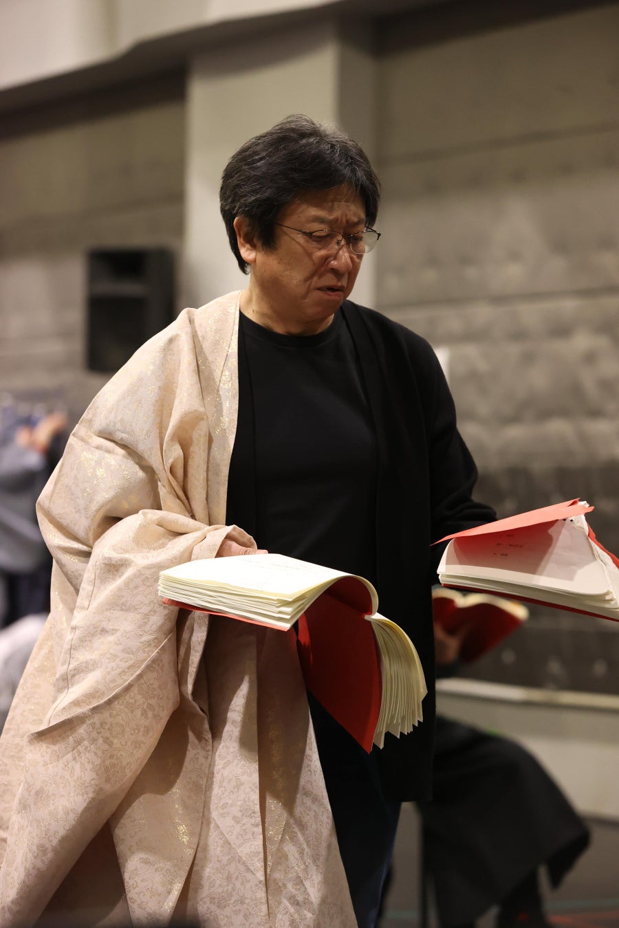 本作は、平家の栄華と没落を描いた古典の名作「平家物語」をベースにしたもの。スーパー戦隊シリーズなどで特撮ファンにはお馴染みの脚本家、小林靖子さんが初めて本格的に舞台の台本を手がけ、靖子さんが台本を書いた「侍戦隊シンケンジャー」で薄皮太夫を好演したことでも知られる朴璐美さんが演出を担当、さらに能や雅楽など和とのコラボレーションも多いダンサーで振付家の森山開次さんが振付・ステージングを担っている。声優が多くを占める出演者が台本を手に演じる内容だが、単なる「朗読劇」ではなく、芝居と朗読、舞踊を融合させた「総合舞台芸術」を標榜している。その意味が、実はあまりよく理解できていなかったのだが、朴璐美さんの「みんな、呼吸を合わせるんだよ!」の呼びかけとともに始まった稽古を見て、なるほど、そういうことか、と膝を打った。