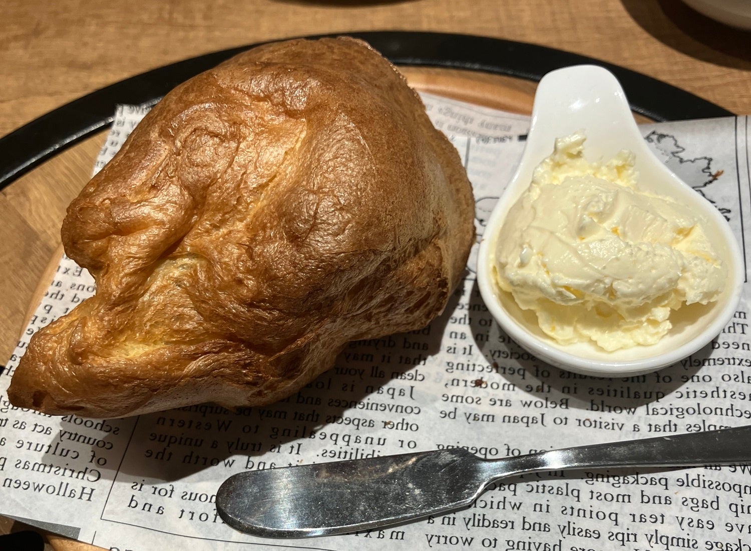 お肉料理やグレービーソースとよく合う、アメリカ発祥のポップオーバー。外側はカリっと香ばしく、中はシュークリームの皮のように空洞で、ふんわりと軽い食感が特徴です。店内で生地から作り、焼きたてを提供いたします。