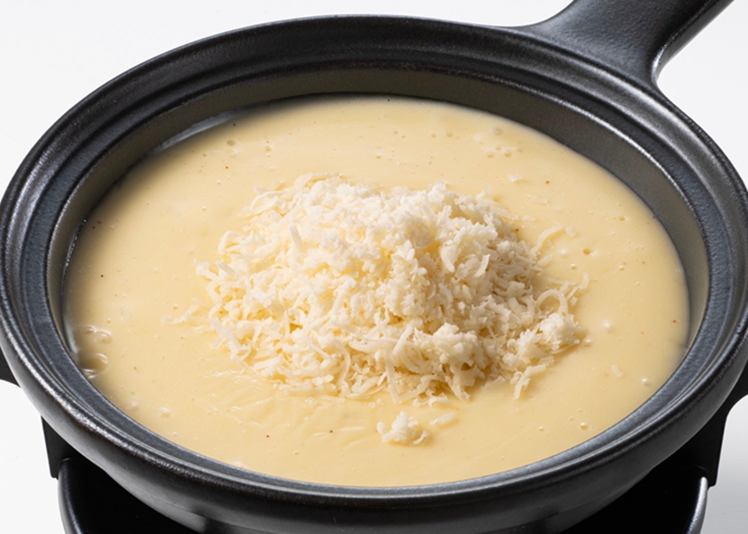 チーズフォンデュソースとラクレットチーズ、パルメザンチーズの3種類のチーズを合わせ、クセがなくとろ~り伸びるように仕上げました。パルメザンチーズは最後にお客様の前で削りたてをご用意。