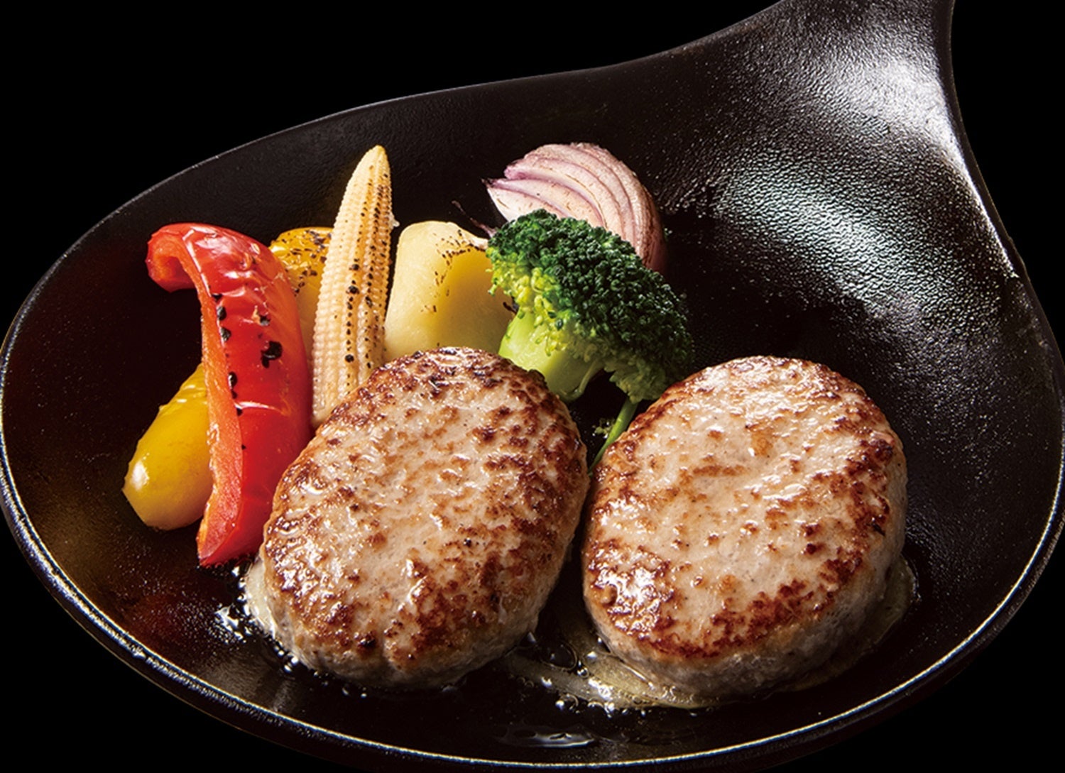 看板商品の「Mia!ハンバーグ」は熱々のスキレットでご提供いたします。南部鉄器なので時間が経っても冷めにくく、最後まで熱々のまま食べられます。