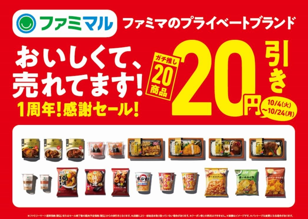 「ファミマル」誕生から1周年を記念し、「ファミマル」の人気商品から20商品を「ガチ推し20商品」として選定し20円引きになる、「ファミマル1周年感謝セール」を、2022年10月4日(火)から2022年10月24日(月)まで実施いたします。