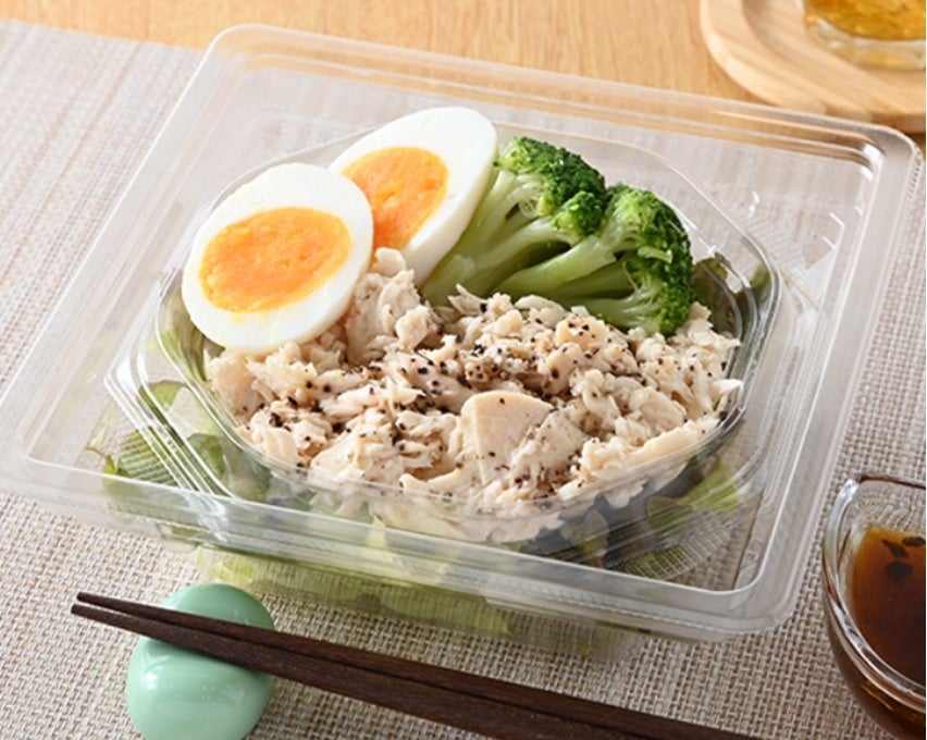 【内容】鶏むね肉、ブロッコリー、玉子をトッピングしたサラダです。別添えのドレッシングは、オリーブオイルを使用した風味豊かな和風ドレッシングです。(1食あたりのたんぱく質19.9g)