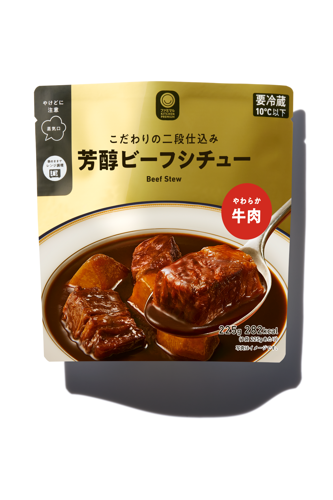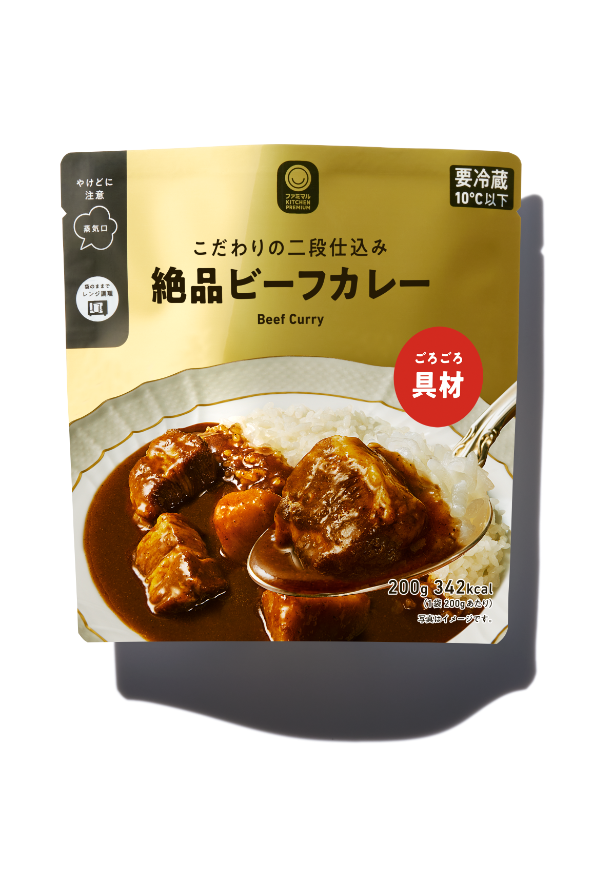 ワンランク上の上質なおいしさを提供してきた「ファミマルKITCHEN PREMIUM」を、味・パッケージともに刷新します。特に、10月3日(月)から発売となる「こだわりの二段仕込み 絶品ビーフカレー」「お肉の旨みを閉じ込めた 極じゅわハンバーグ」「こだわりの二段仕込み 芳醇ビーフシチュー」の3品は、贅沢な味わいを実現するためにさまざまな工夫を凝らしています。