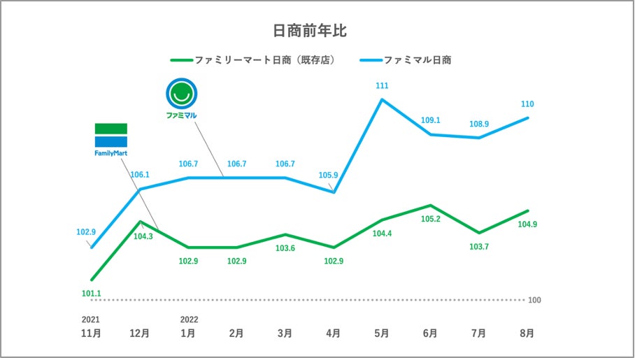 プライベートブランド「ファミマル」は2021年10月19日に発売を開始して以後、プライベートブランドの日商前年比において、毎月(10ヶ月)連続で100%超えを記録しました。またファミリーマートとしても既存店日商売上前年比でも、同期間において10ヶ月連続100%超えを記録しております。