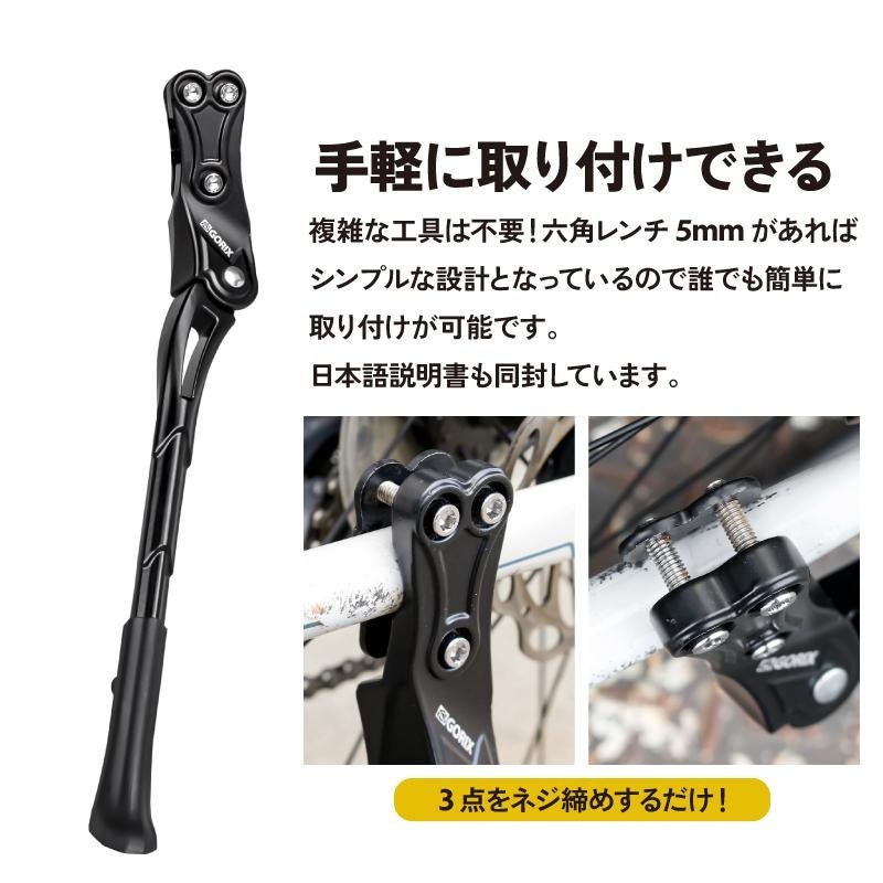 「簡単取り付け!幅広い自転車に対応するキックスタンド」