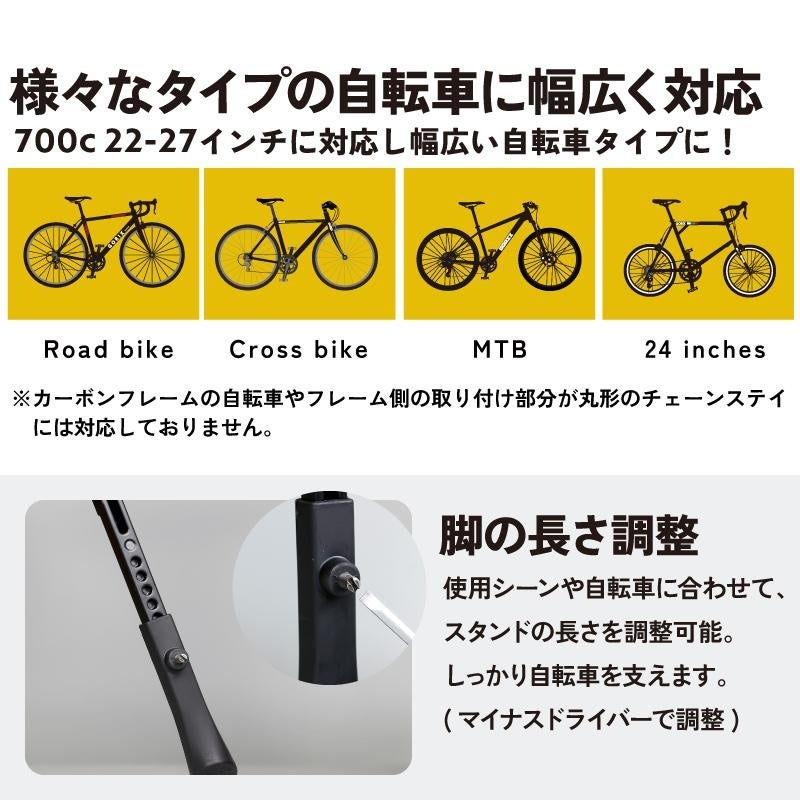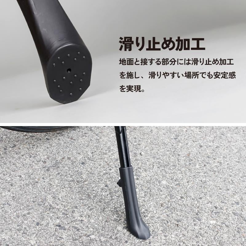 使用シーンや自転車に合わせて、スタンドの長さを調整可能。しっかり自転車を支えます。